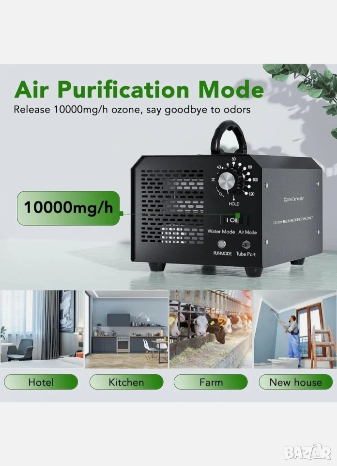 Озоновият генератор с концентрация от 10 000 мг/ч има силна почистваща сила, но миризмата на озон е сравнително неприятна.