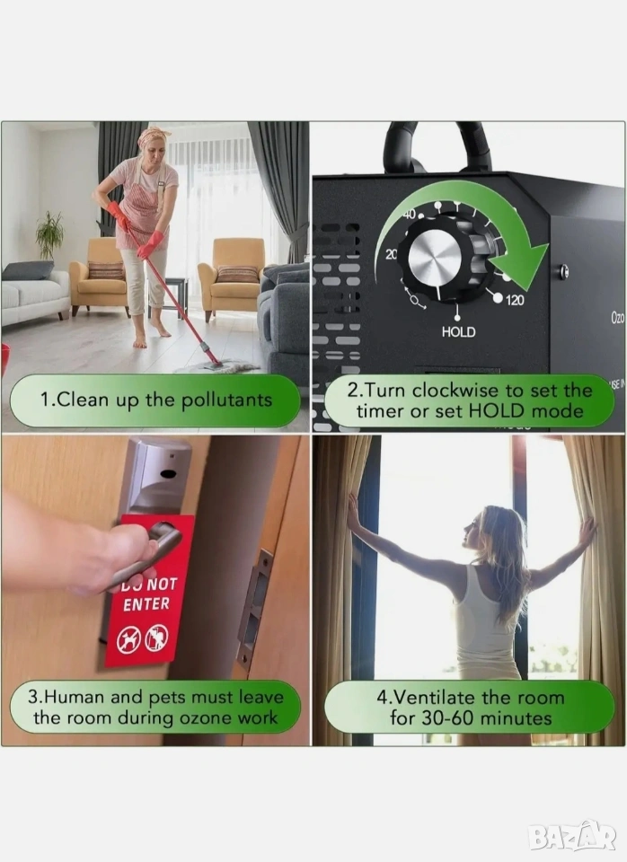 ЛЕСЕН ЗА ИЗПОЛЗВАНЕ: Просто завъртете копчето за време на озоновия генератор, за да настроите времето за производство на озон и излезте от стаята. Можете да използвате режим „HOLD“, за да произвеждате озон непрекъснато. Озоновият генератор ще спре да работи автоматично, когато времето изтече, моля, изчакайте търпеливо 30 до 60 минути, след което отворете вратите и прозорците, за да проветрите.