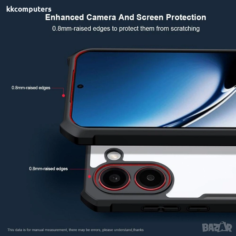 0.8 mm повдигнати ръбове за защита: Издигнатите ръбове около камерния модул и екрана (0.8 mm) предпазват от директен контакт с повърхности, предотвратявайки драскотини и повреди.