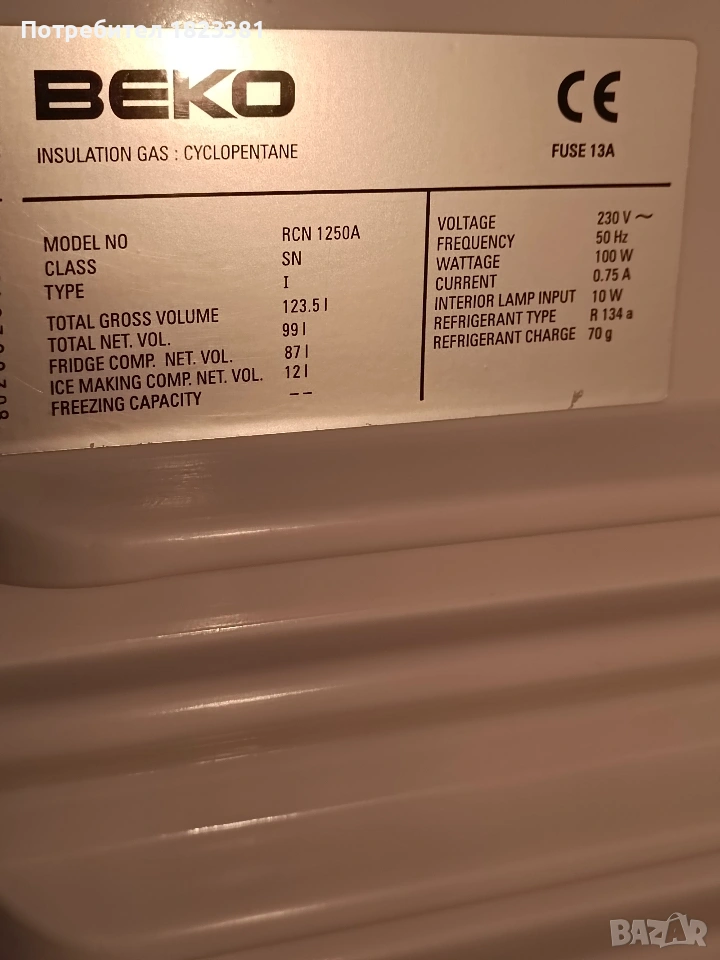 Beko RCN 1250A. Общ обем: 99 литра. Хладилна част: 87 литра. Фризерна част: 12 литра. Захранване: 230 V~, 50 Hz, 100 W.В много добро състояние,много тихо работи.Размери широчина-49см, дълбочина-54см,височина-85дм.