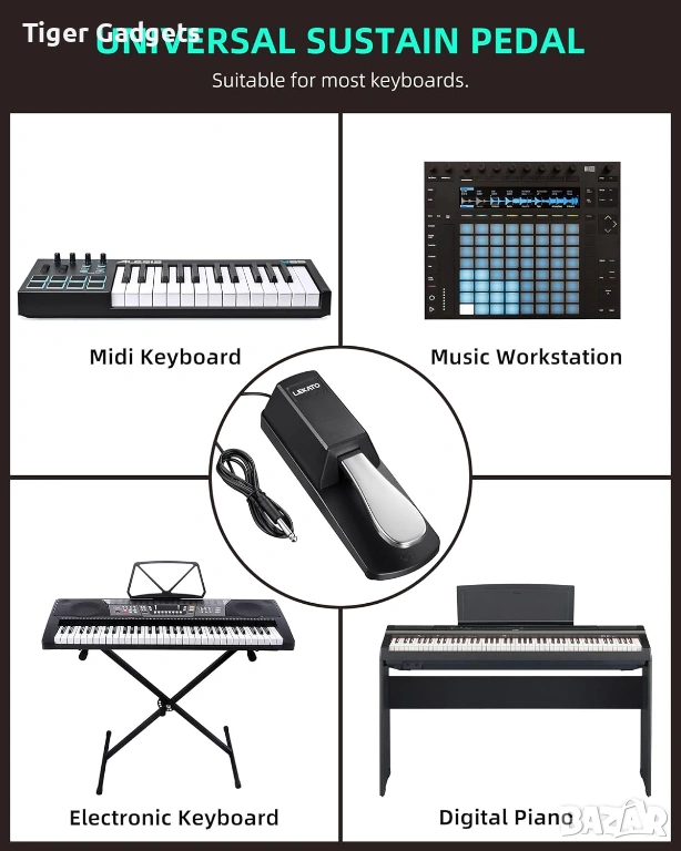 LEKATO DP-10 е универсален sustain педал за дигитални пиана и клавири, създаден да осигури реалистично усещане като при акустично пиано. Подходящ за Yamaha, Casio, Roland и други марки.