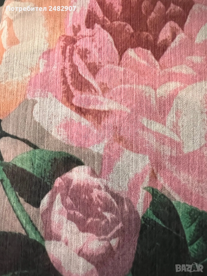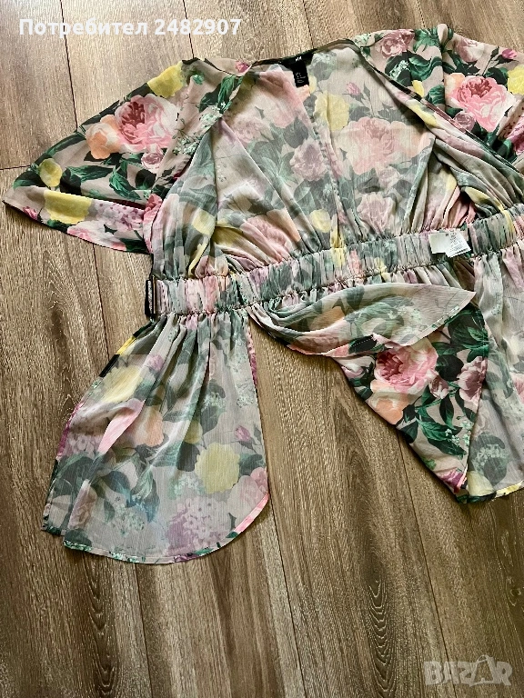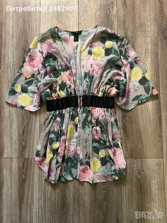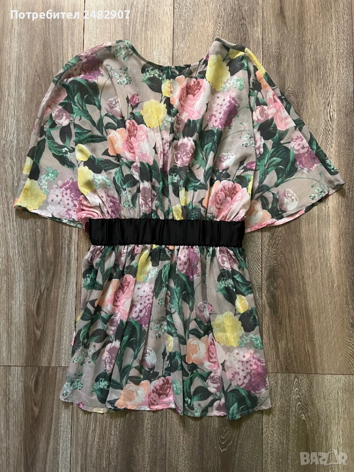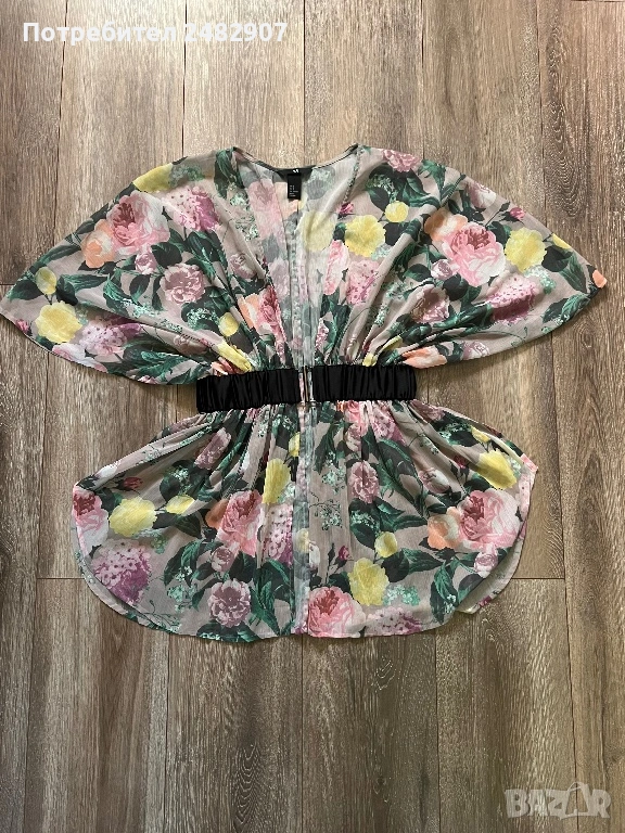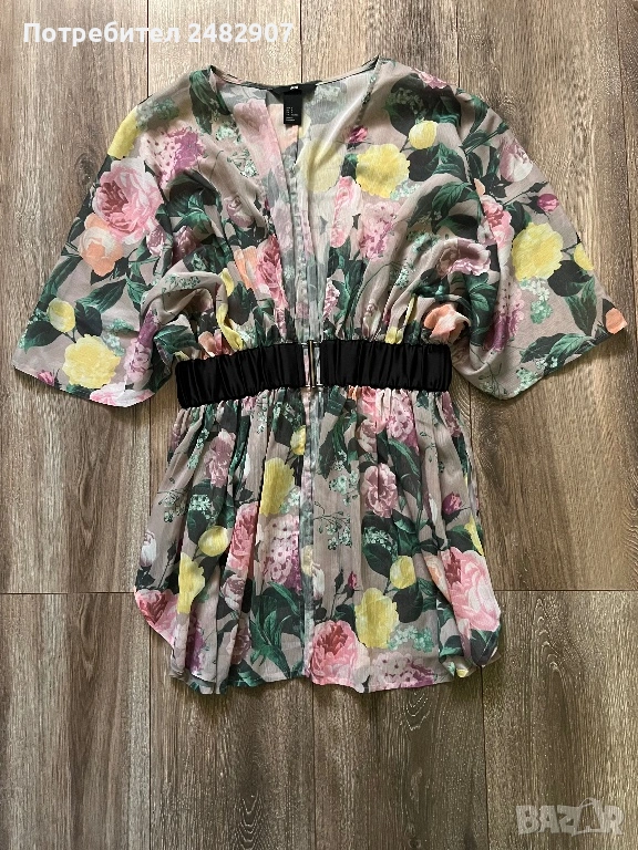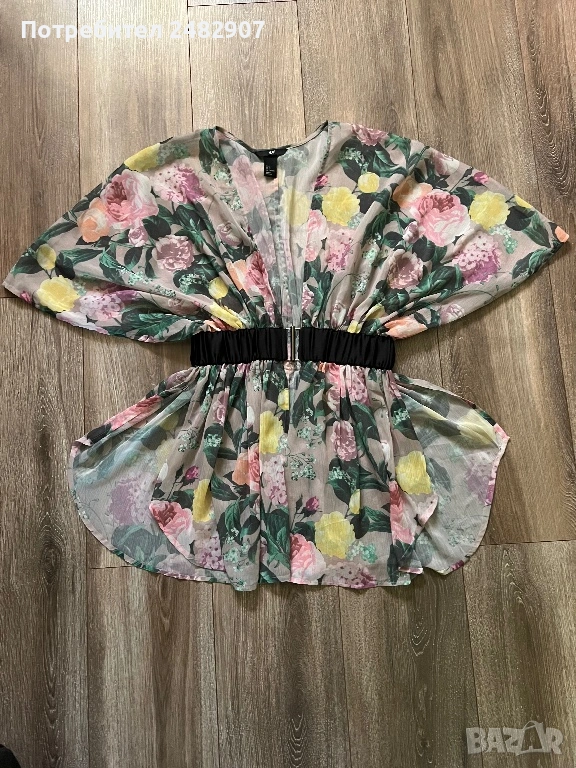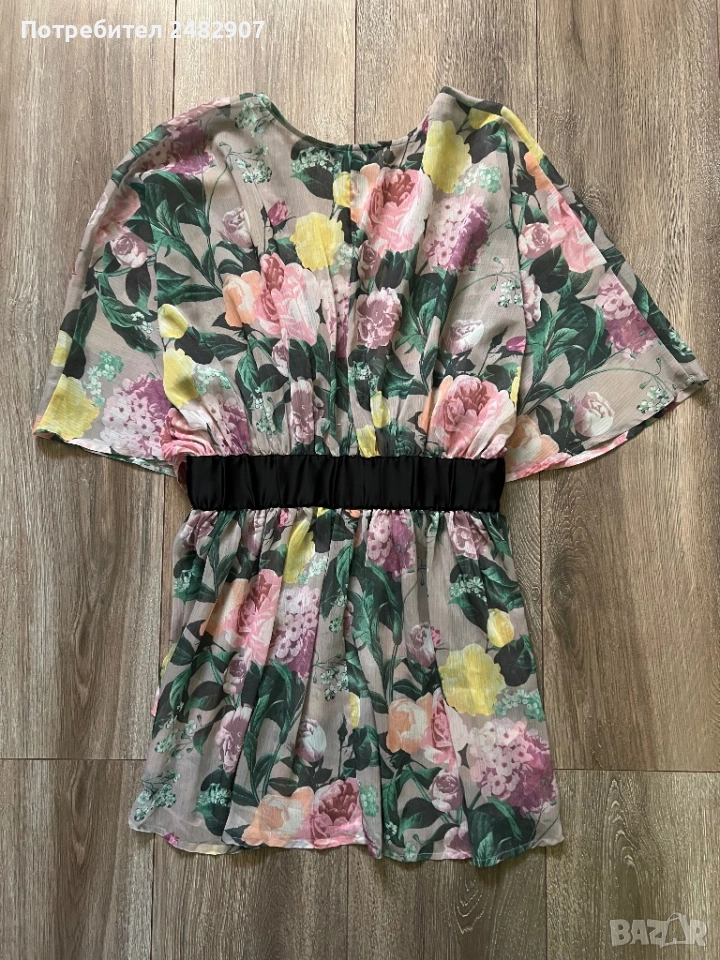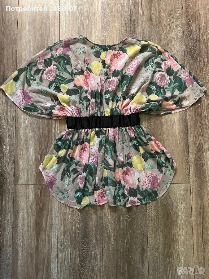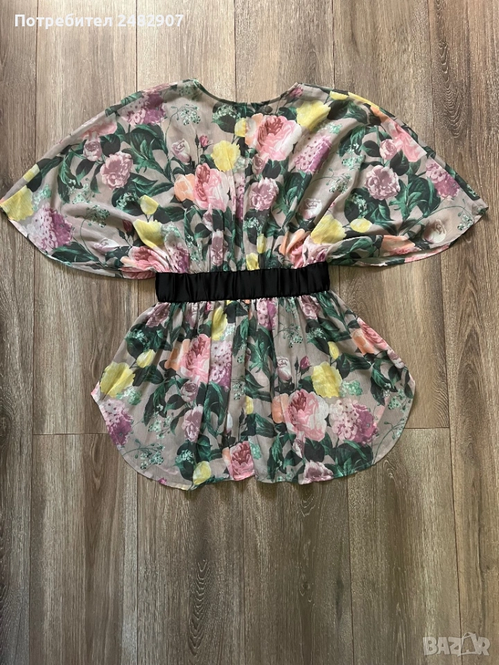 Елегантно дамско горнище /Отворена туника с флорални мотиви, размер S. Съдържа 100 % полиестер. Ширина в горната част - 100 см, ширина в талията - 34 см, ширина в долната част - 73 см, дължина от деколтето до долу - 77 см.Много запазено, обличано веднъж за повод, полупрозрачно, с цепки отстрани - от талията до долу, дълги 22 см.
