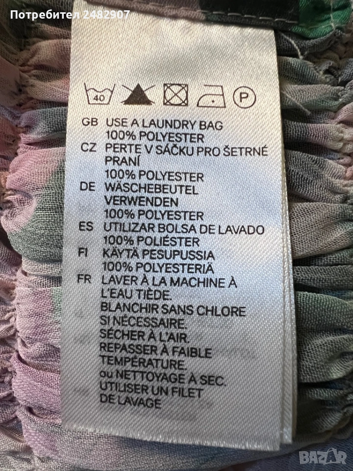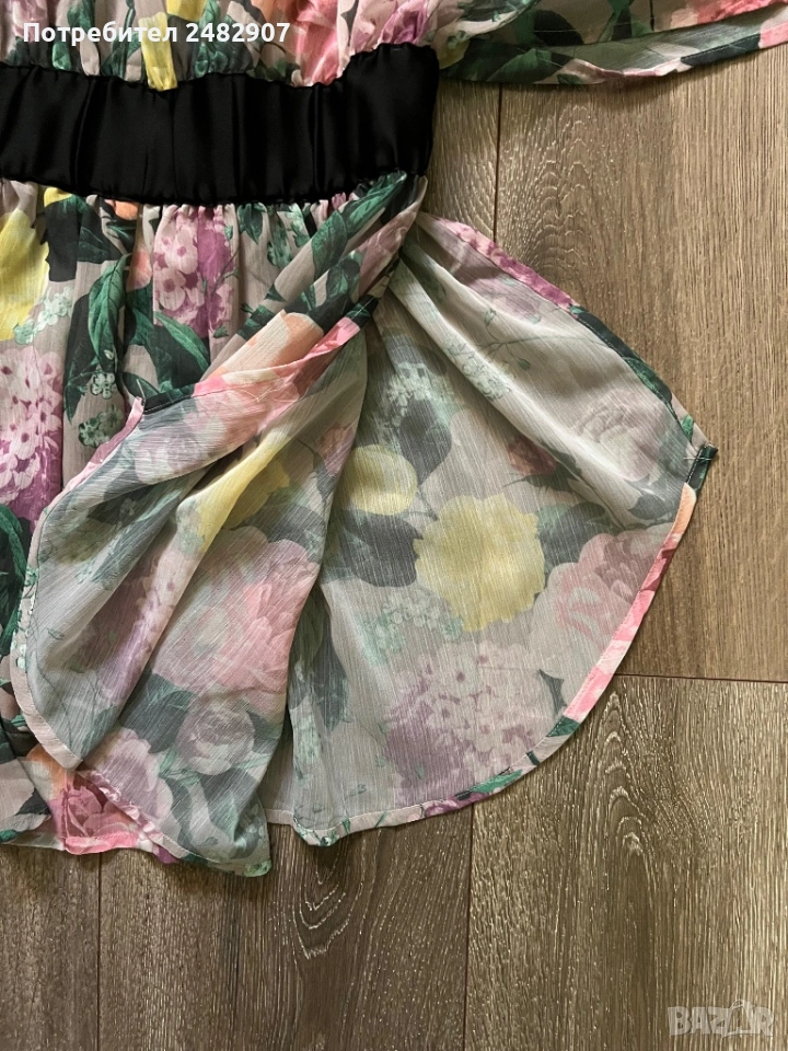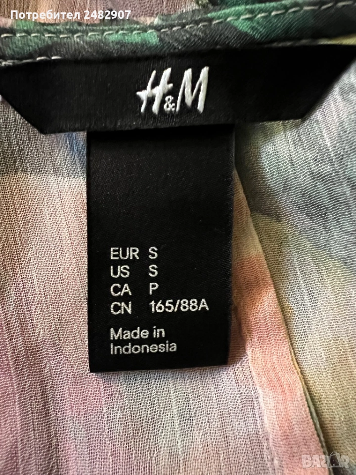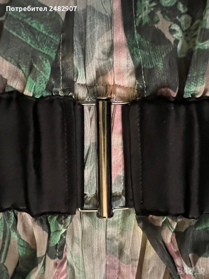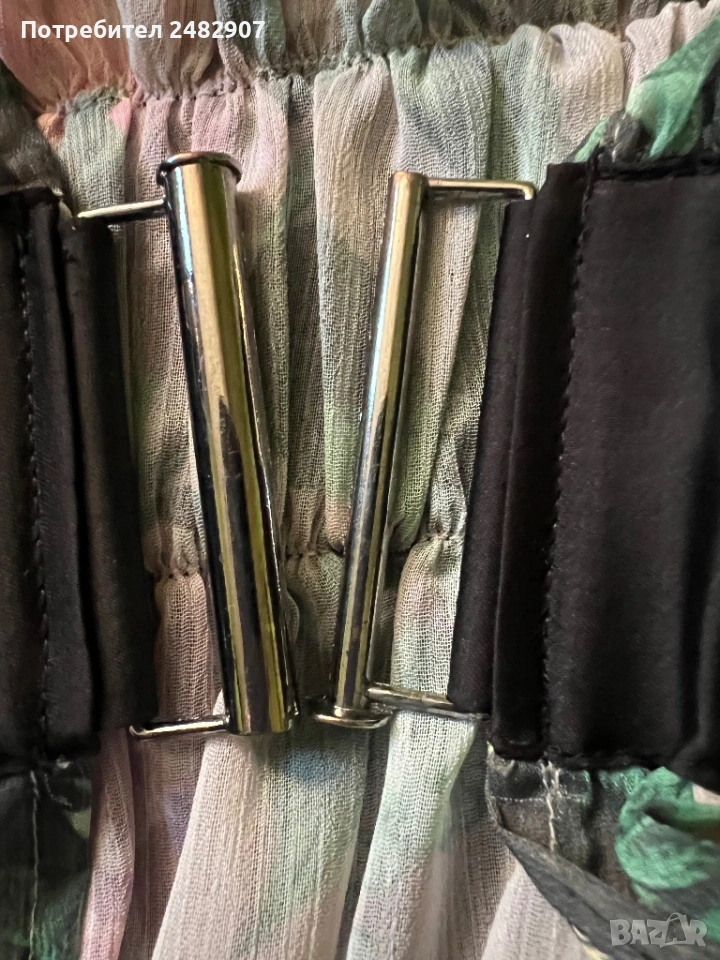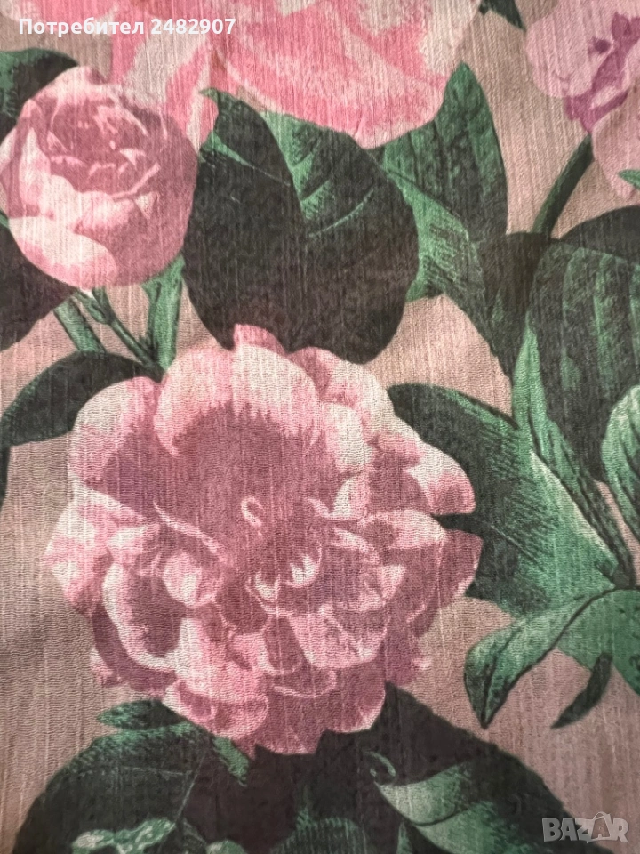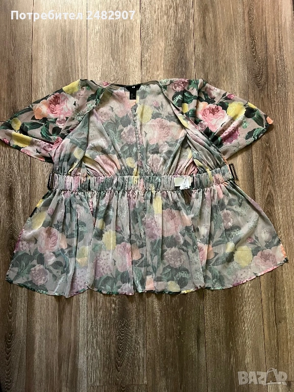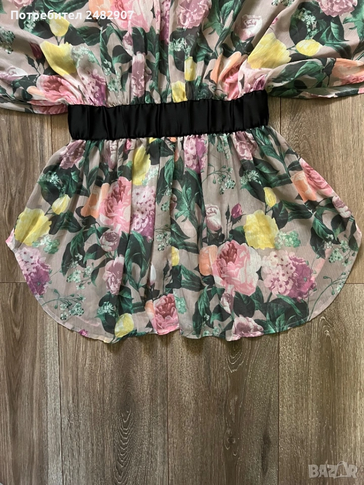 Елегантно дамско горнище /Отворена туника с флорални мотиви, размер S. Съдържа 100 % полиестер. Ширина в горната част - 100 см, ширина в талията - 34 см, ширина в долната част - 73 см, дължина от деколтето до долу - 77 см.Много запазено, обличано веднъж за повод, полупрозрачно, с цепки отстрани - от талията до долу, дълги 22 см.