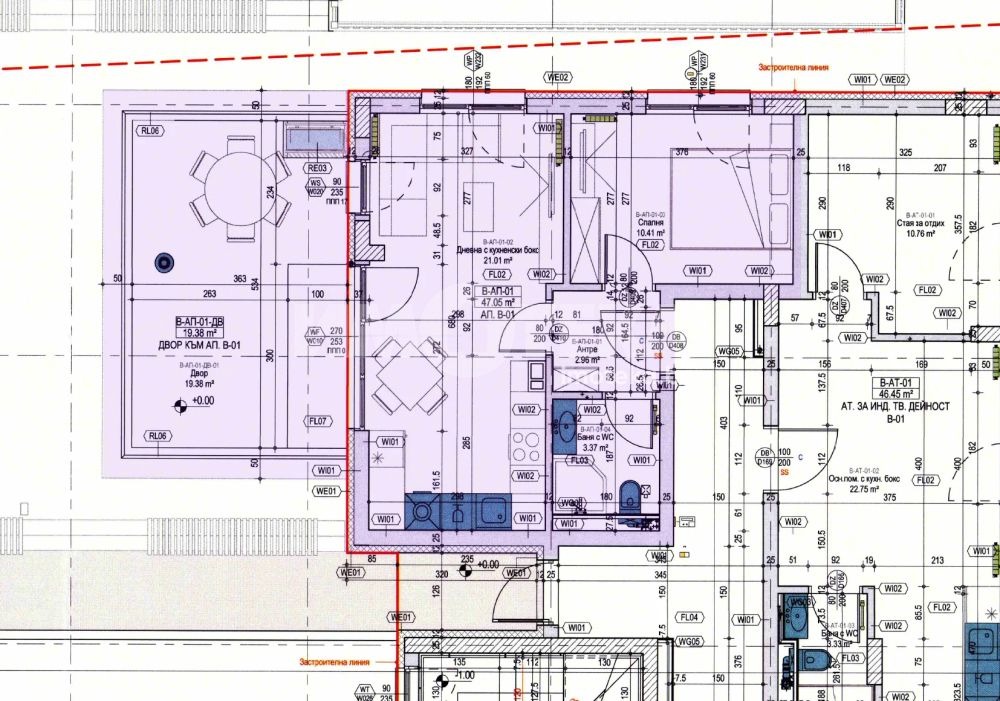 Двустаен апартамент с площ 59,48м2 / ЗП 47,05м2 на партерен етаж със собствен, прилежащ двор 19,38м2. Има възможност за закупуване на подземно паркомясто или гараж!