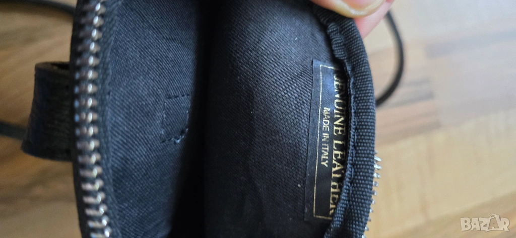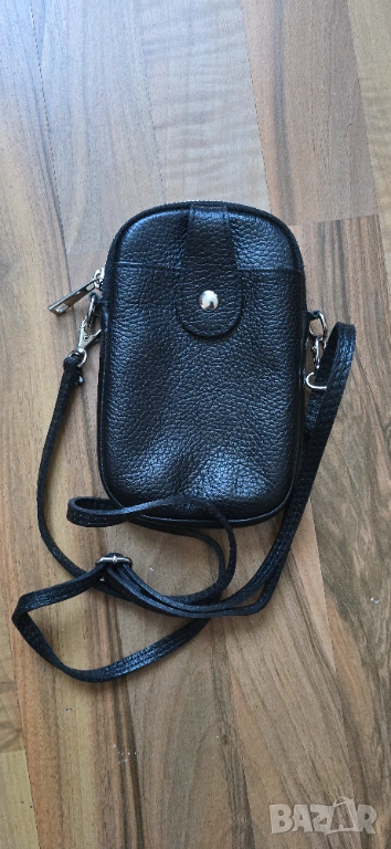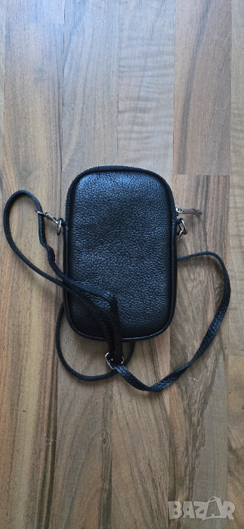 Малка дамска чанта от естествена кожа, в черен цвят. Ползвана много малко, без никакви забележки. С едно отделение затваряне се с цип и едно за поставяне на телефон с магнитно закопчаване. Произведена в Италия.