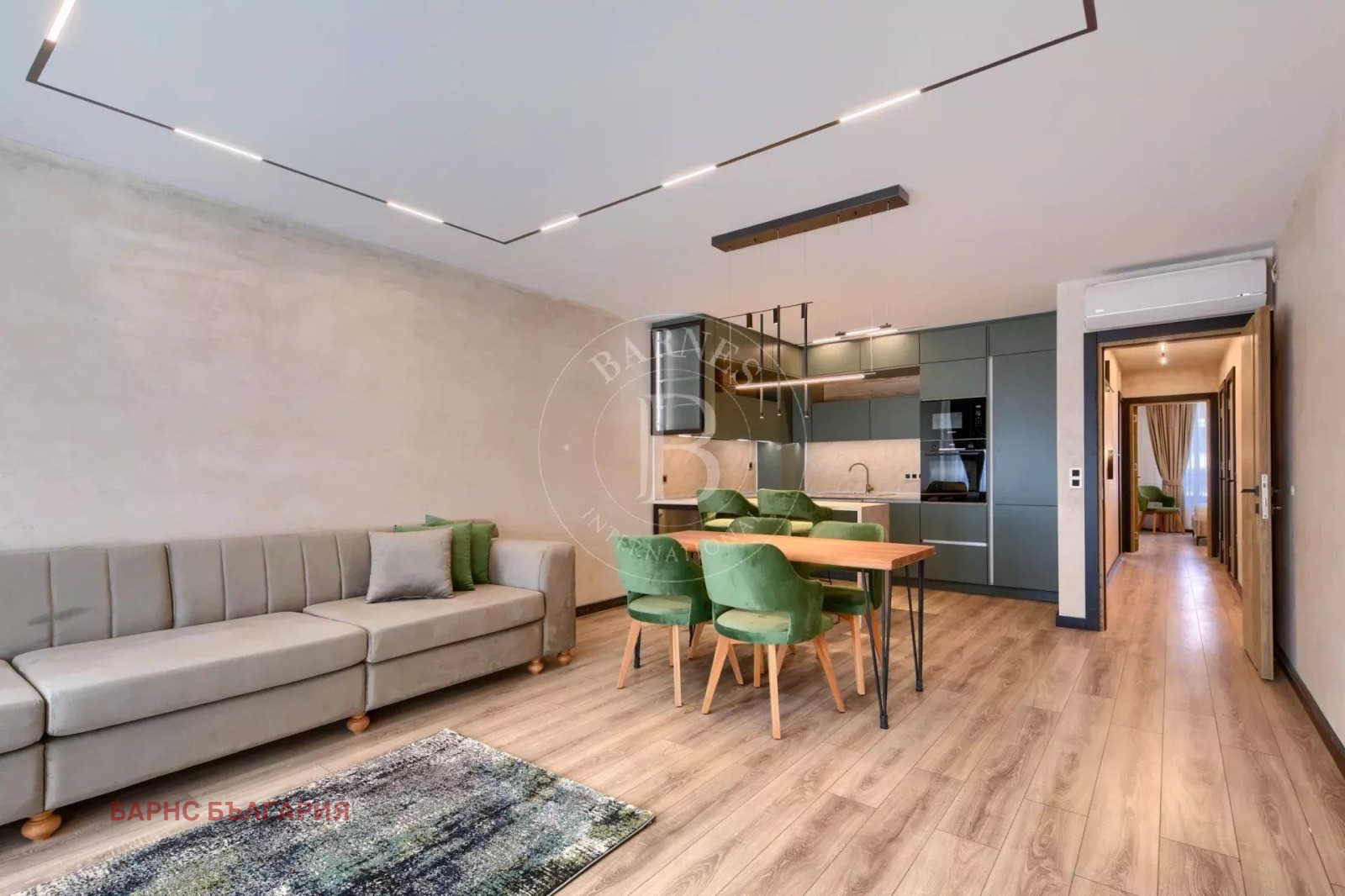 Имотът разполага с просторна и слънчева всекидневна с южно изложение, завършена в земни цветове със зелени акценти. Пространството включва голям диван, трапезна маса и напълно оборудван кухненски бокс с полуостров, а при желание от бъдещите наематели може да бъде закупен и поставен голям smart телевизор.