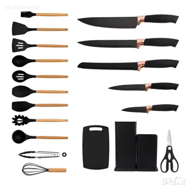 Кухненски комплект от 19 части Cheffinger KSUT01 - ножове, силиконови прибори, поставка и дъска → Обява 54138568