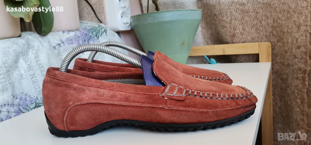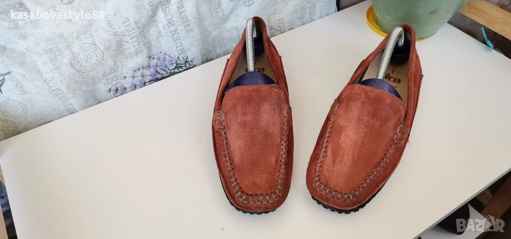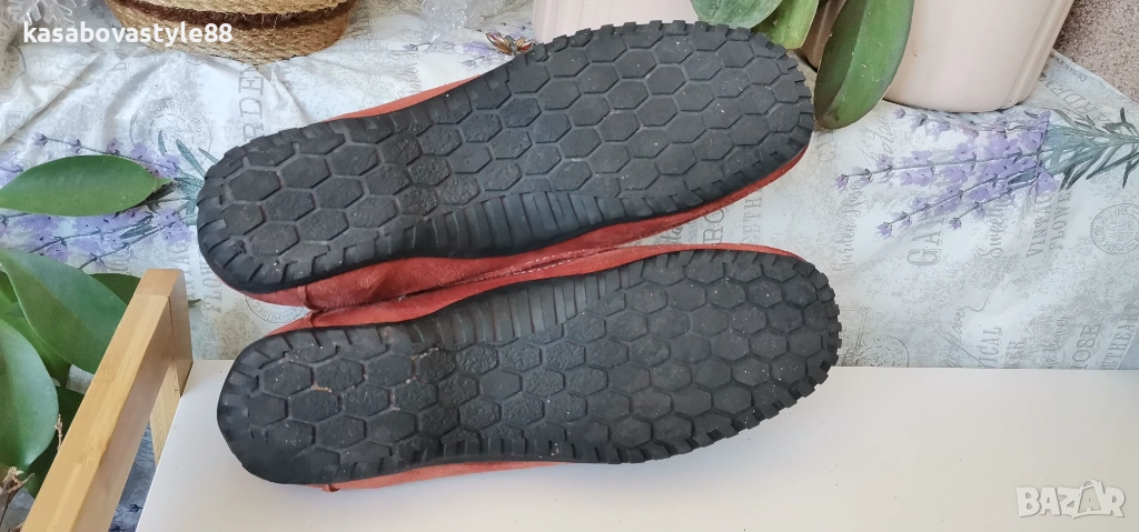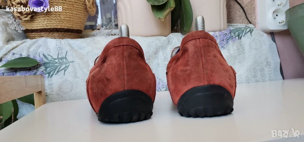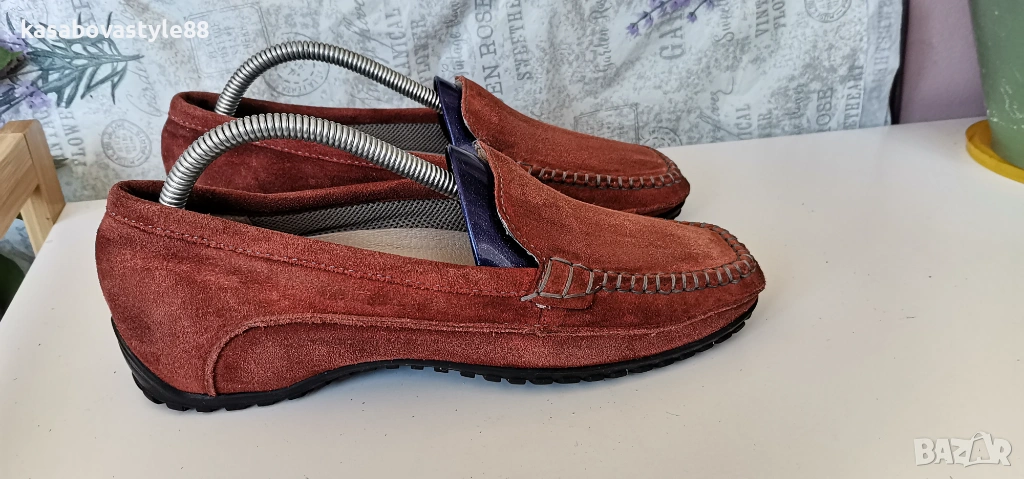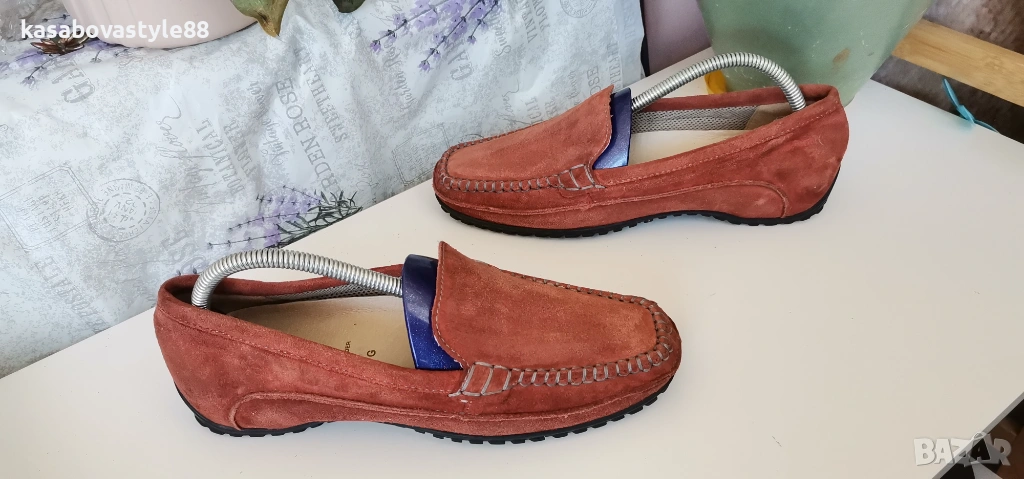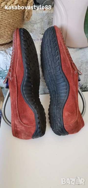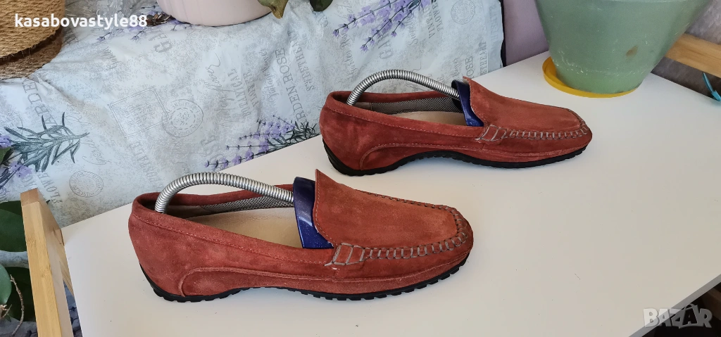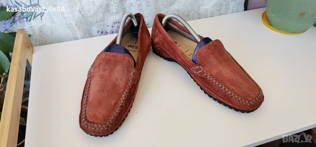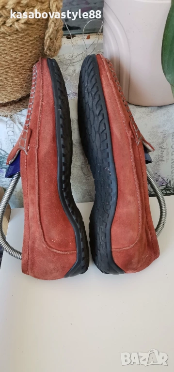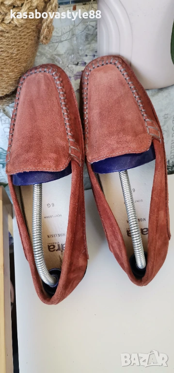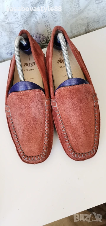 Наситено-кафяви велурени мокасини от немската марка Ara Неразличими от нови!! Те са проектирани за често и продължително вървене, олекотени и еластични, с мека кожена стелка отвътре. Чудесни за ежедневието, осигурявайки надеждност и много комфорт. По етикет са 39 н но отговарят на 38.5 н. Дължина на стелка 25см.Цялостна височина отзад 8.5см.