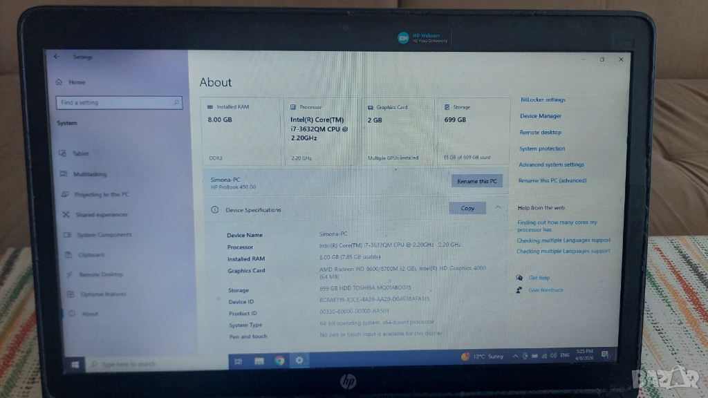 Твърд диск: 750 GB HDD (бележка: дискът е бавен и вероятно за смяна)