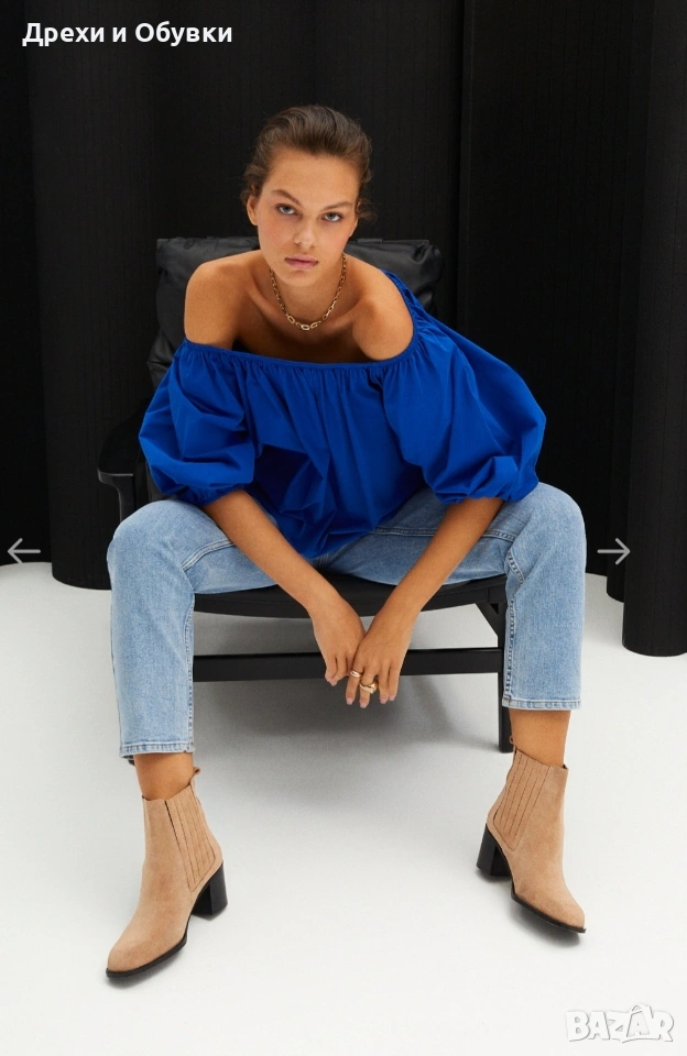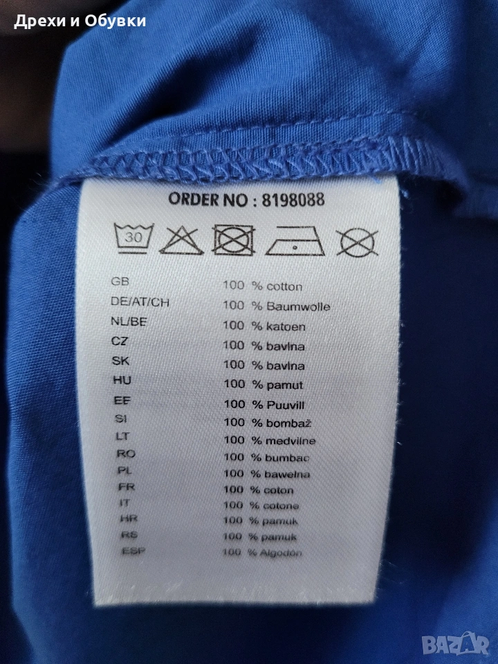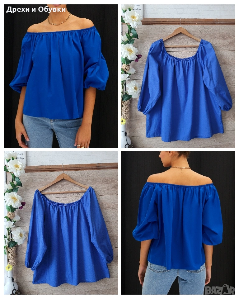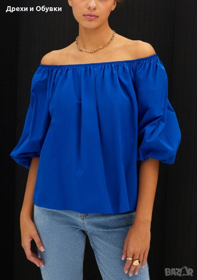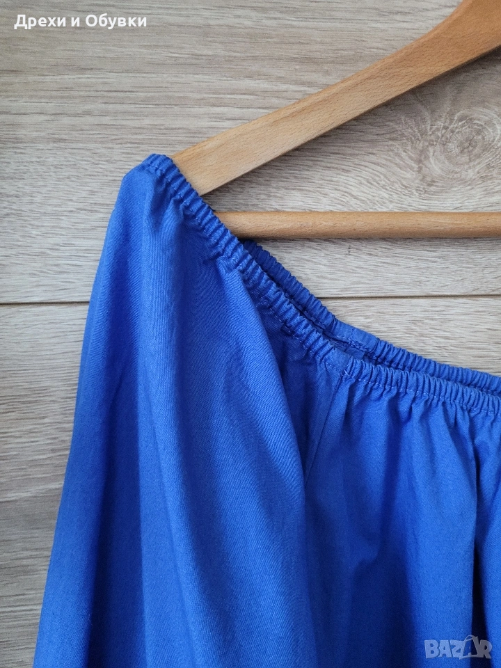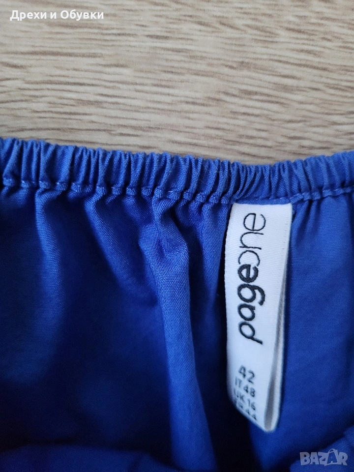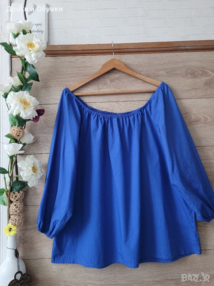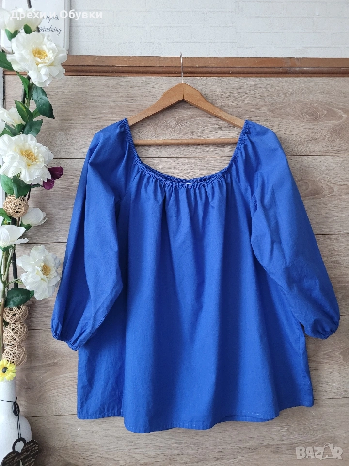 Красива лятна синя блузка на марката PAGEONE. Материя 100% памук. Ластик около деколтето ( позволява да се носи както с паднали рамене така и нормално около деколтето и раменете). Модела е със свободна лека и комфортна кройка. Подходяща за ежедневието с дънки, къси панталони или с панталон или пола за по елегантна визия. Размер по етикет 44 ( ХЛ). Не е носена! Дълга 66см, гръдна 120см ( носи се свободно). Цена 17€