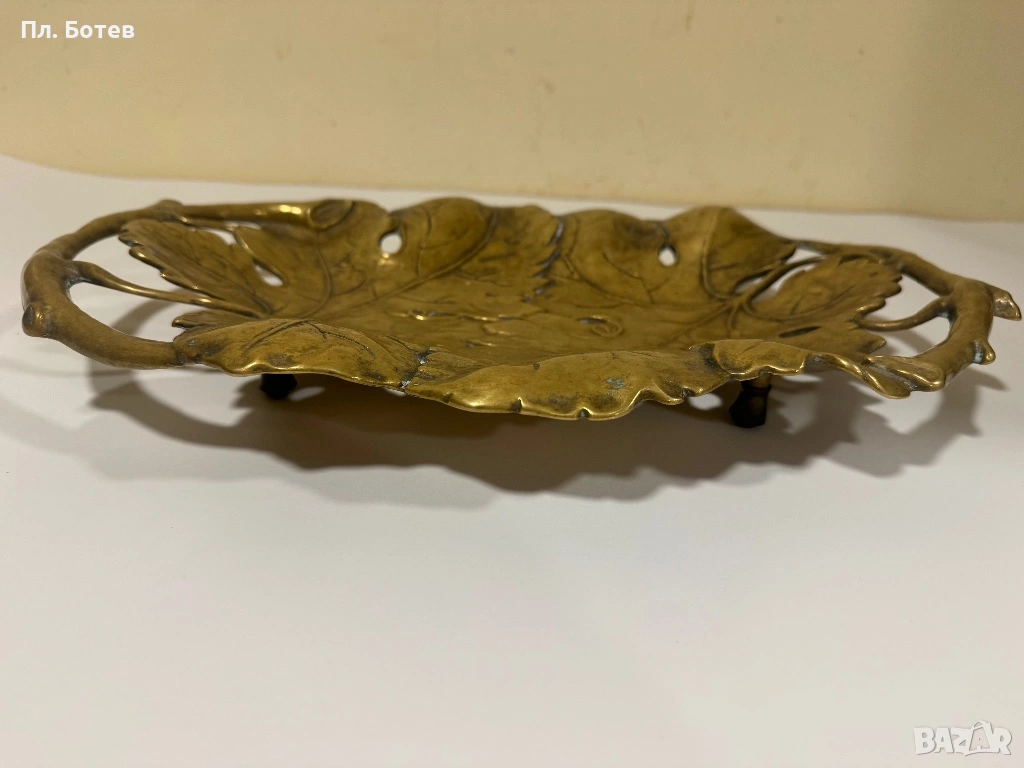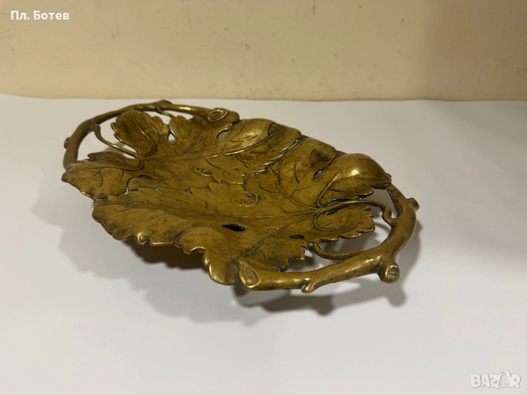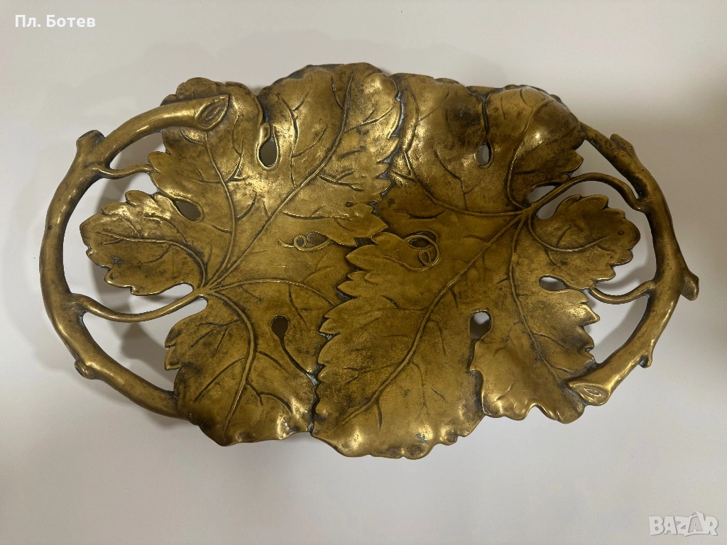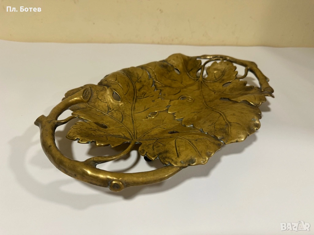 Красив декоративен поднос с форма на листа, изработен в стил Art Nouveau. Подносът е с богати детайли, релефни жилки на листата и декоративни дръжки във формата на клонки.
