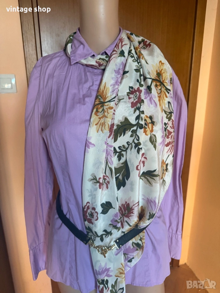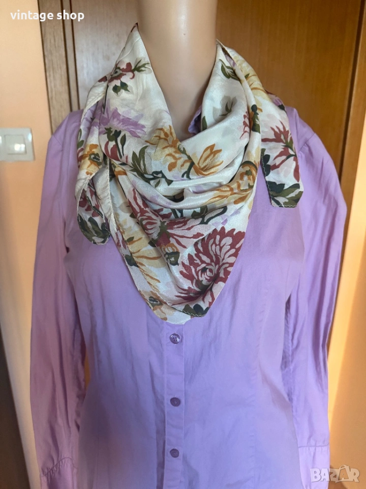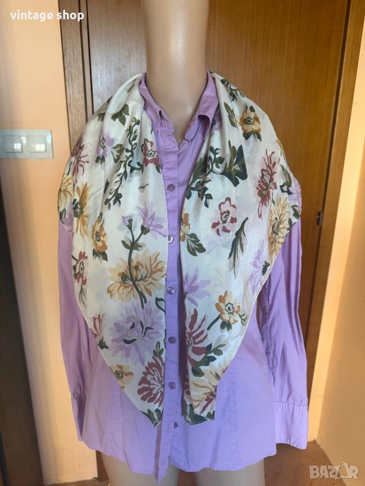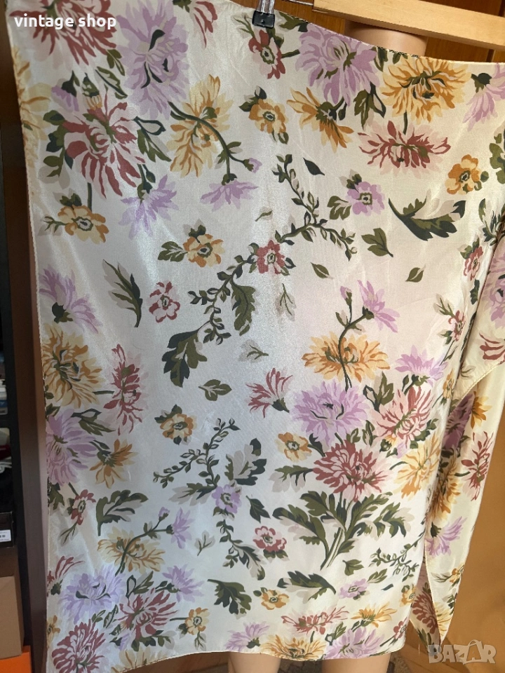 Разкошен копринен пъстър шал с флорален десен. Пъстрите цветя от материята позволяват да се комбинира с няколко тоналности. На снимките е комбиниран с бледолюляков цвят, на фона, на който се откроява много ефектно.