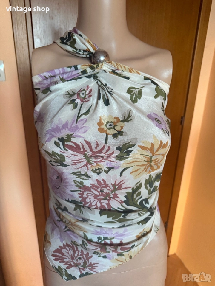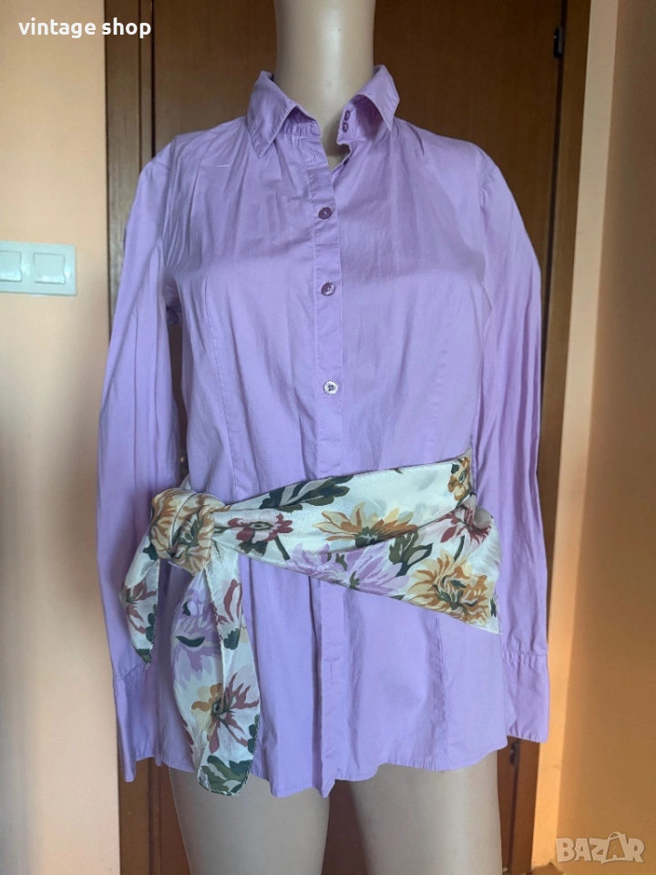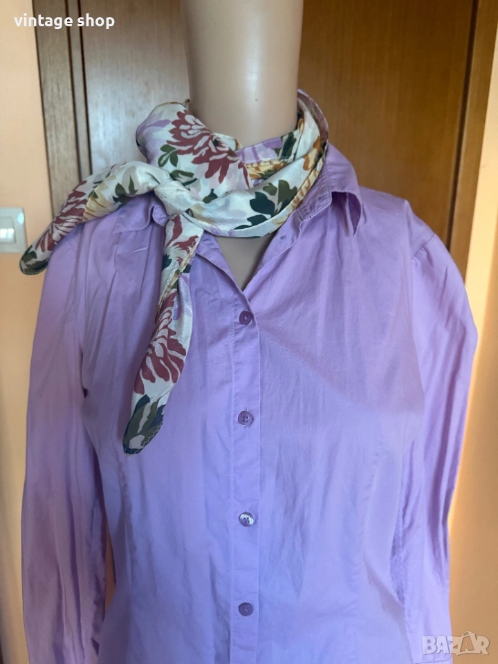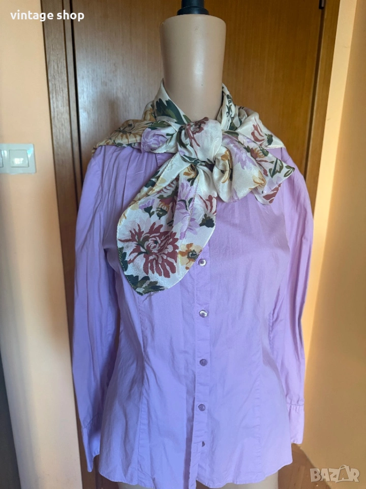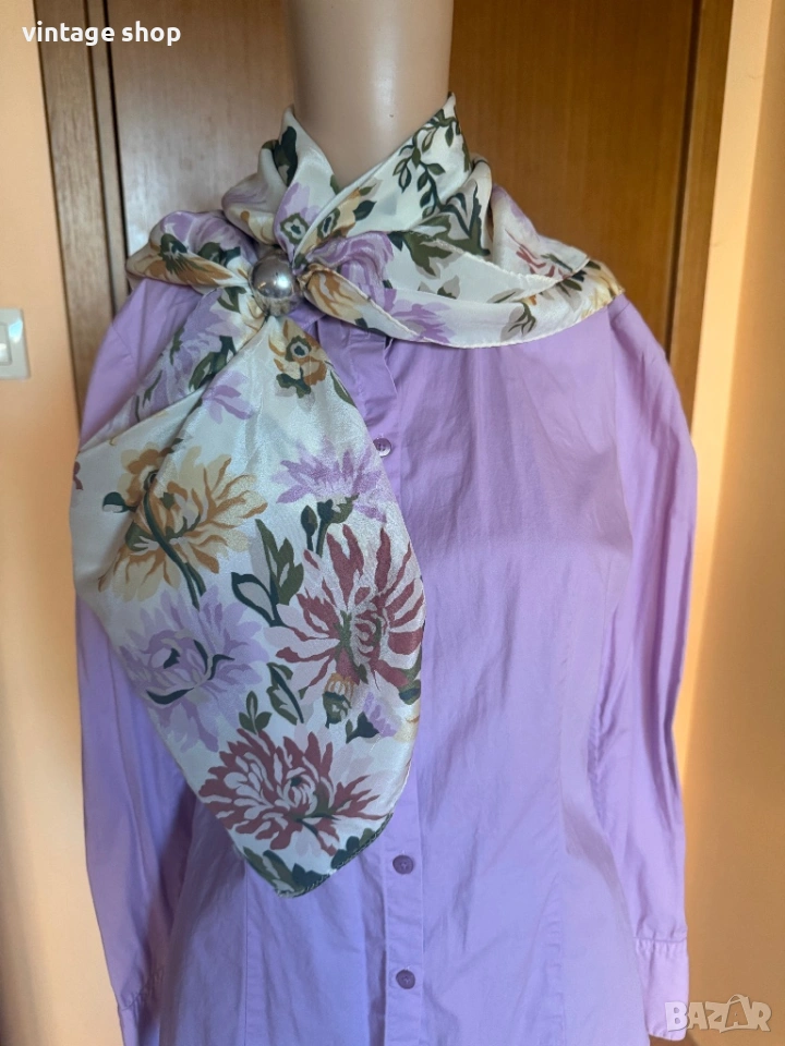 Разкошен копринен пъстър шал с флорален десен. Пъстрите цветя от материята позволяват да се комбинира с няколко тоналности. На снимките е комбиниран с бледолюляков цвят, на фона, на който се откроява много ефектно.