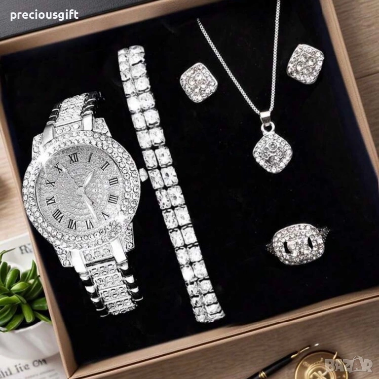 Дамски комплект от 5 части - часовник, колие, гривна, обеци и пръстен → Обява 54139151