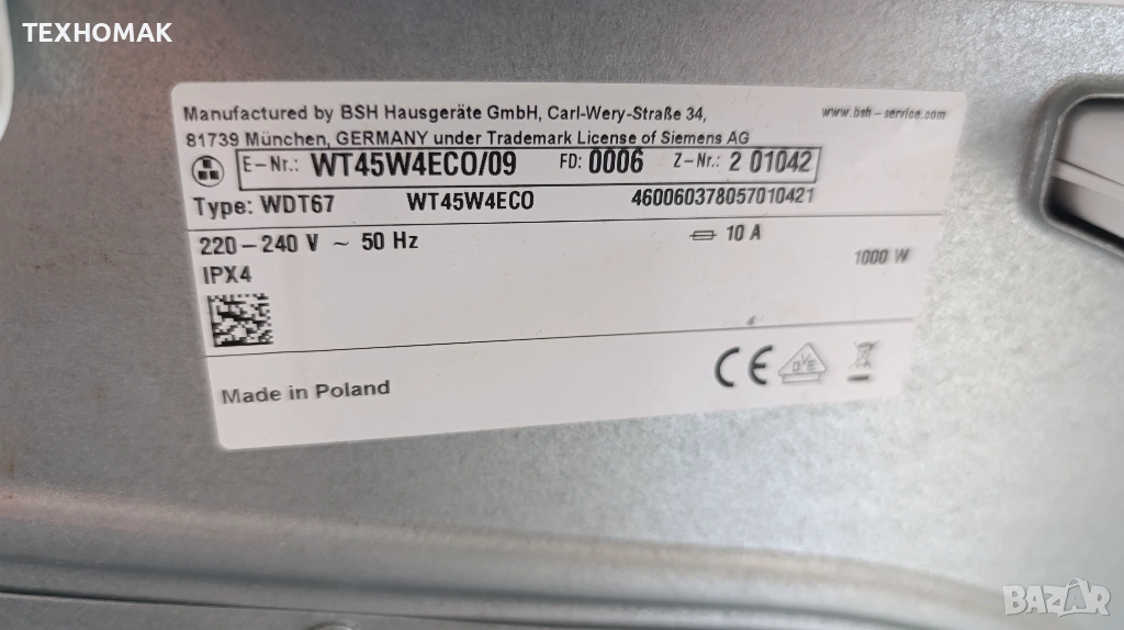 Сушилня SIEMENS IQ 500 клас А+++ термопомпа 8кг. Инверторен мотор → Обява 54139744