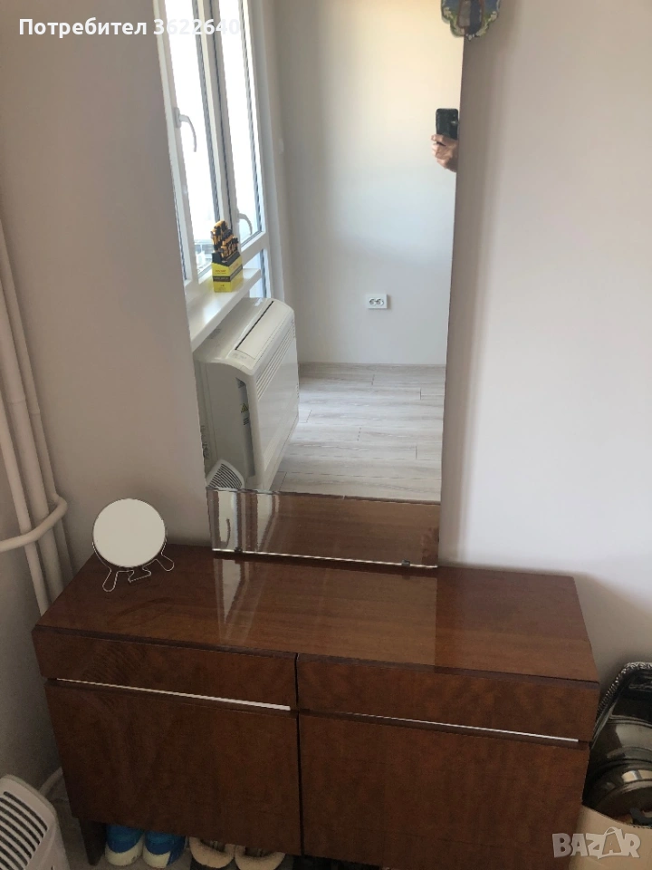 Спалня с четирикрилен гардероб с надстройка, плюс две ракли, тоалетка с оглрдало и табуретка, и две нощни шкафчета. Спалнята е без матрак. Но основата за матрак си върви със спалнята. Тел#:0877438204