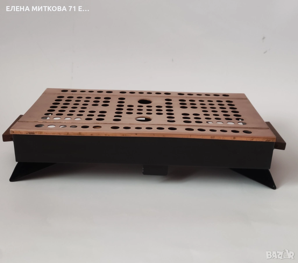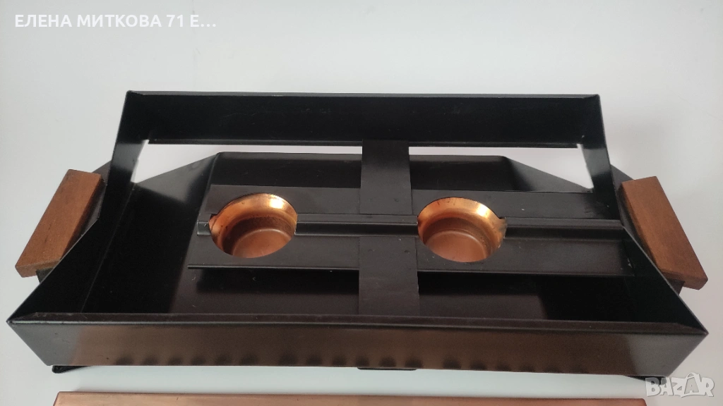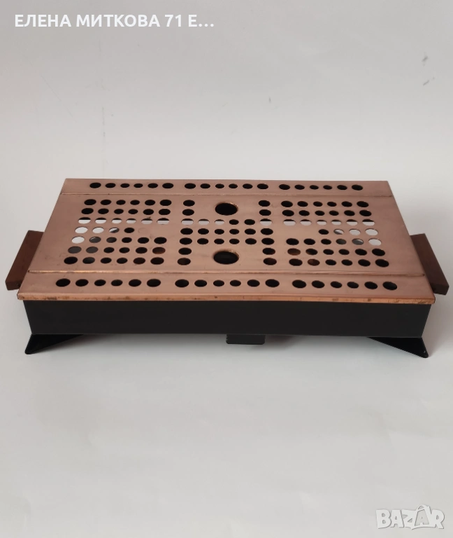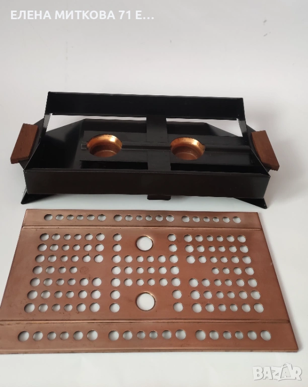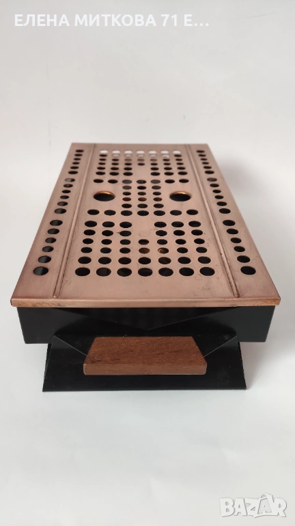 Основата е от желязо , а перфорираната горна част и леглата за свещите са от мед.Дръжките са от дърво