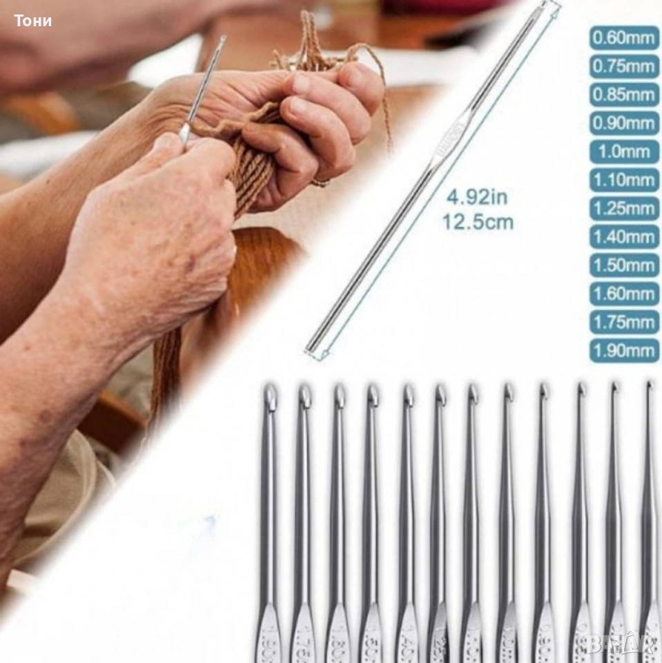 Размери / вместимост: 9 ергономични куки (2.0–6.0 мм), 12 метални мини куки (0.6–1.9 мм), 58 части общо; чанта с многократно затваряне, с компактни размери;