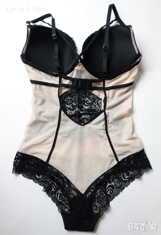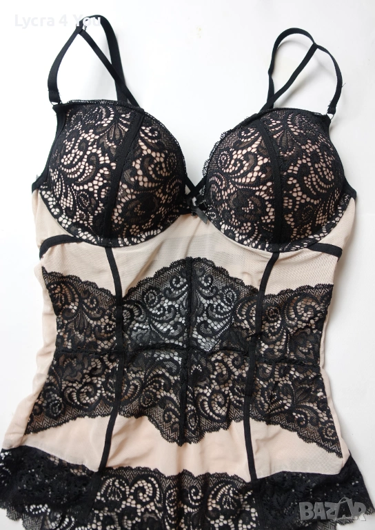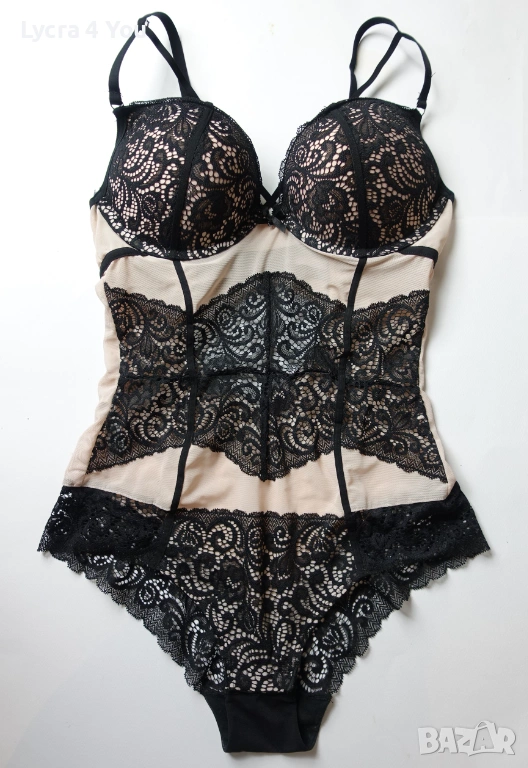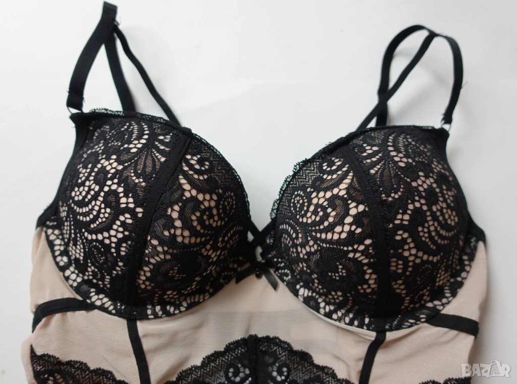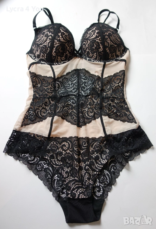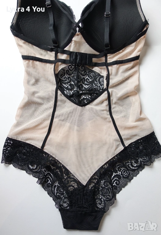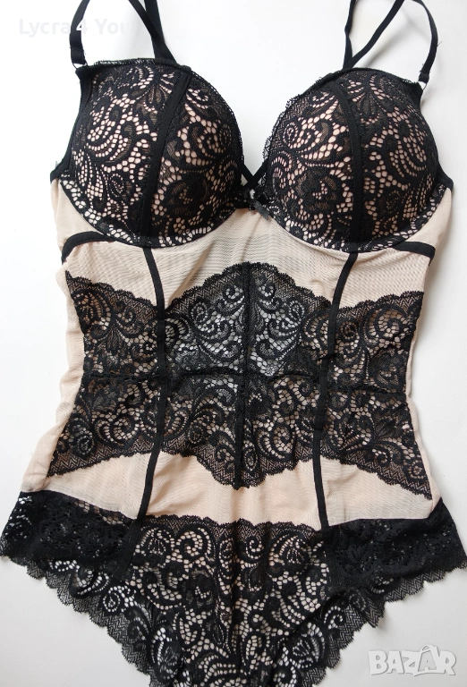 Като ново, луксозно боди на Secret Possessions с красива черна дантела върху телесен тюл, с черни ластични ленти и орнаменти. Отзад е тип бразилиана с черна дантела по краищата. Чашките са с дунапрен и оформени. Размер по етикет 75С, но става и за чашка В.