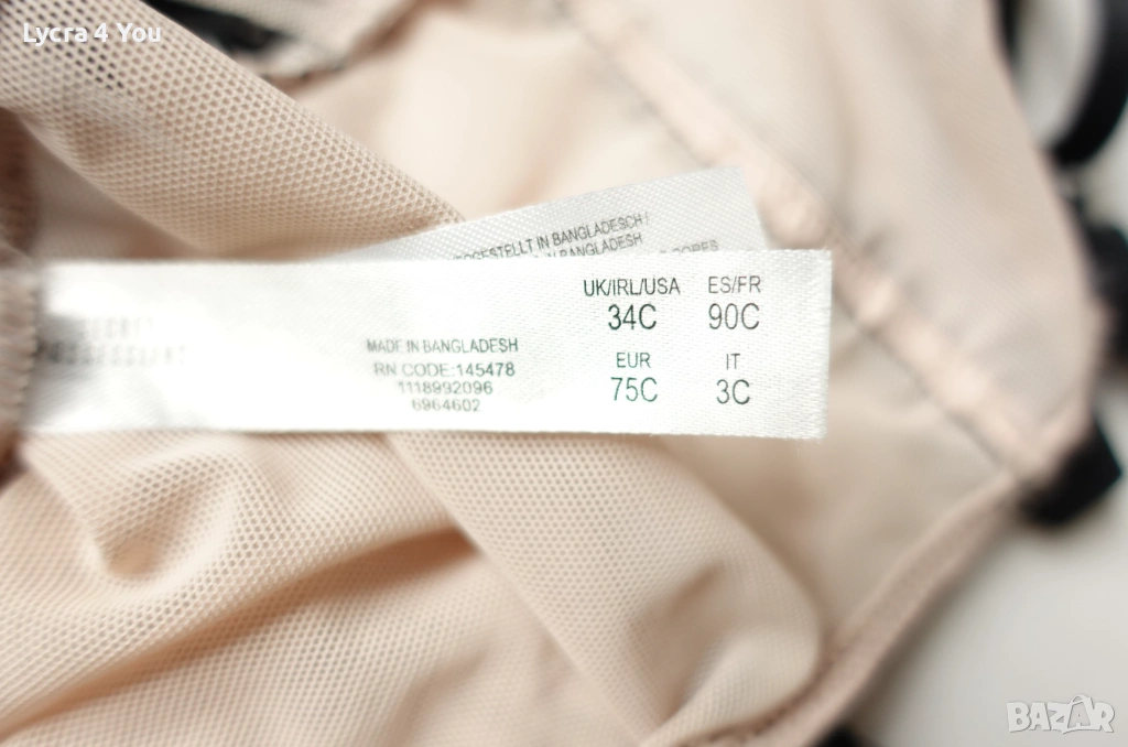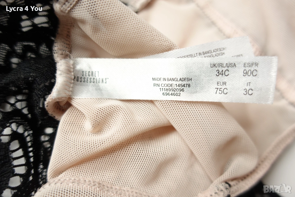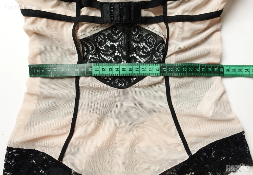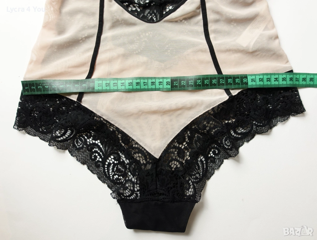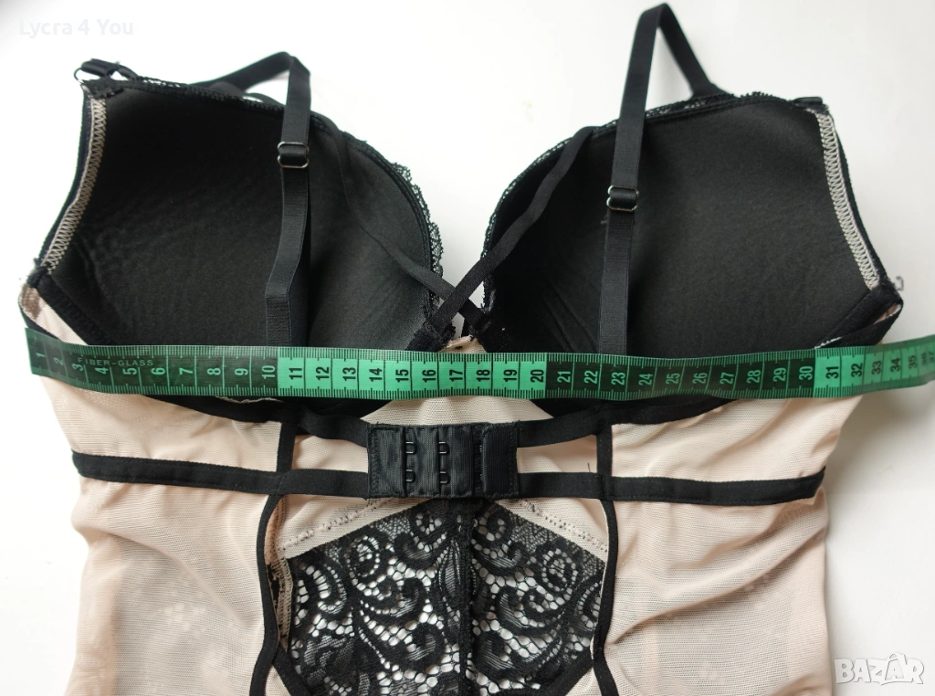 Като ново, луксозно боди на Secret Possessions с красива черна дантела върху телесен тюл, с черни ластични ленти и орнаменти. Отзад е тип бразилиана с черна дантела по краищата. Чашките са с дунапрен и оформени. Размер по етикет 75С, но става и за чашка В.