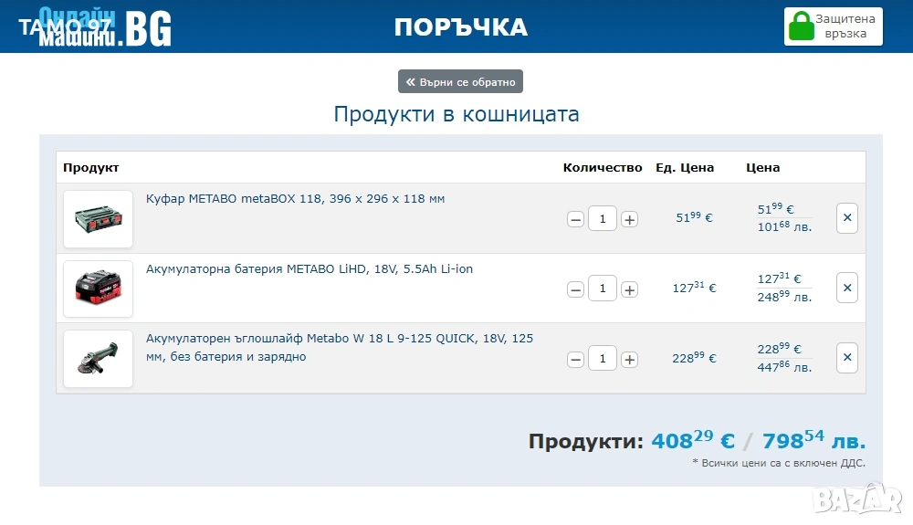 Магазинската цена на ъглошлайфа с батерията е: 408евро