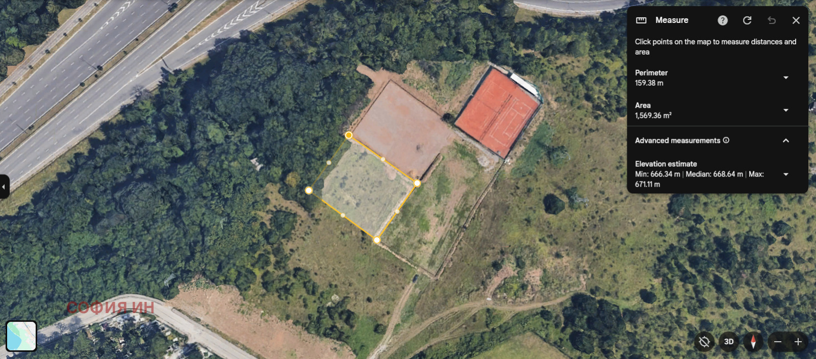 Имотът е с площ от 1566 кв.м, представлява частна собственост и попада в урбанизирана територия с предназначение за застрояване. Парцелът е равен и с удобна форма, като границите му са определени от девет точки, което създава добри предпоставки за оптимално проектиране. Към момента достъпът не е по асфалтов път, но необходимите комуникации електричество, вода и канализация се намират в непосредствена близост.