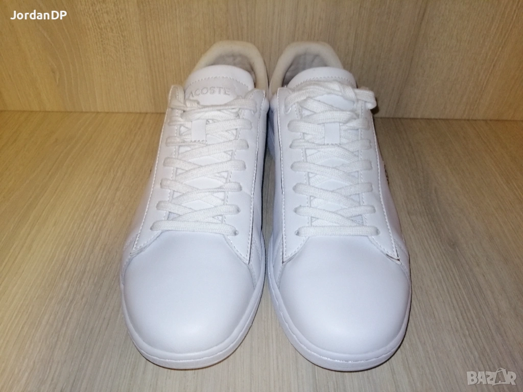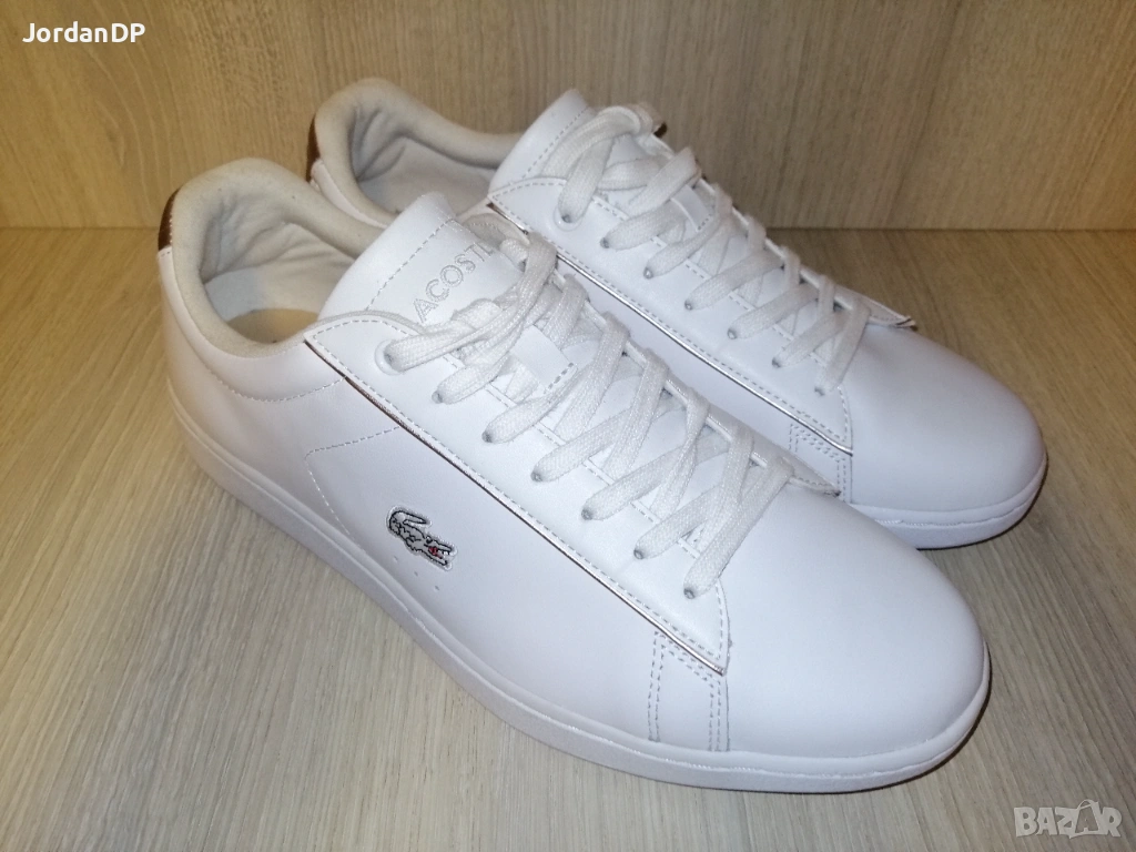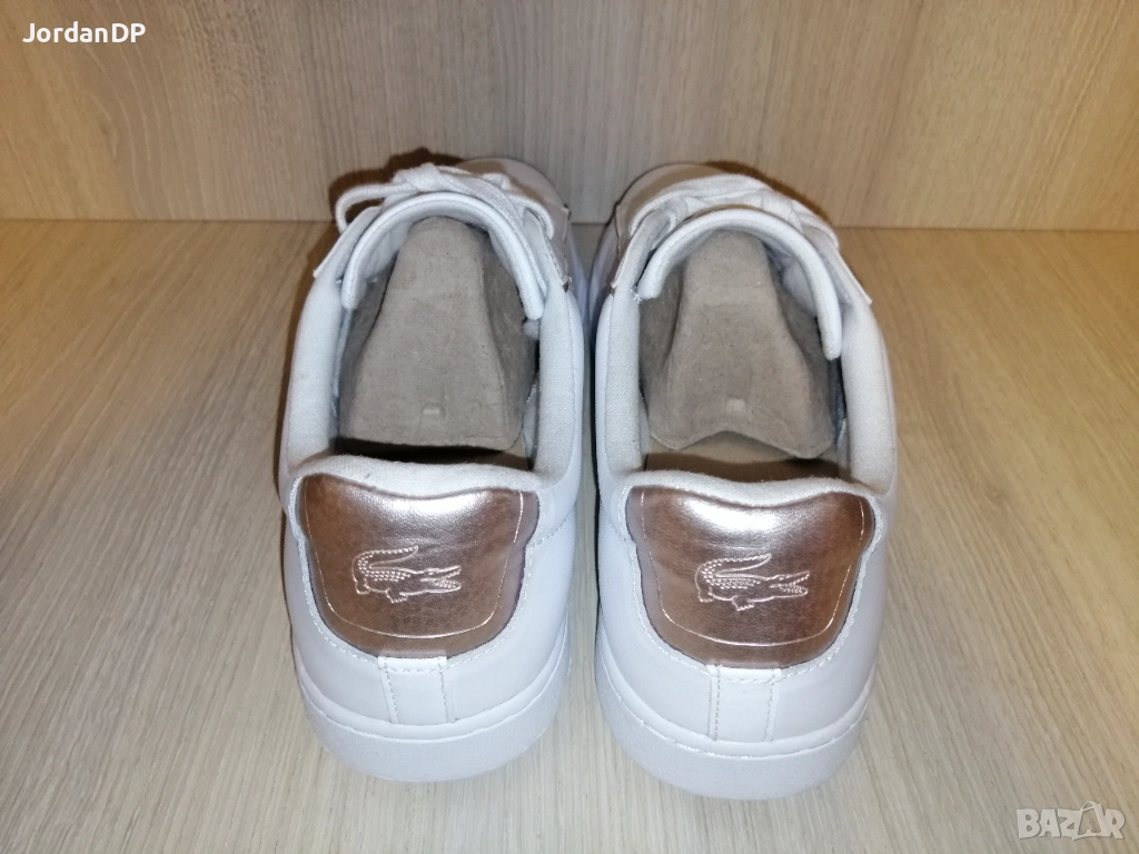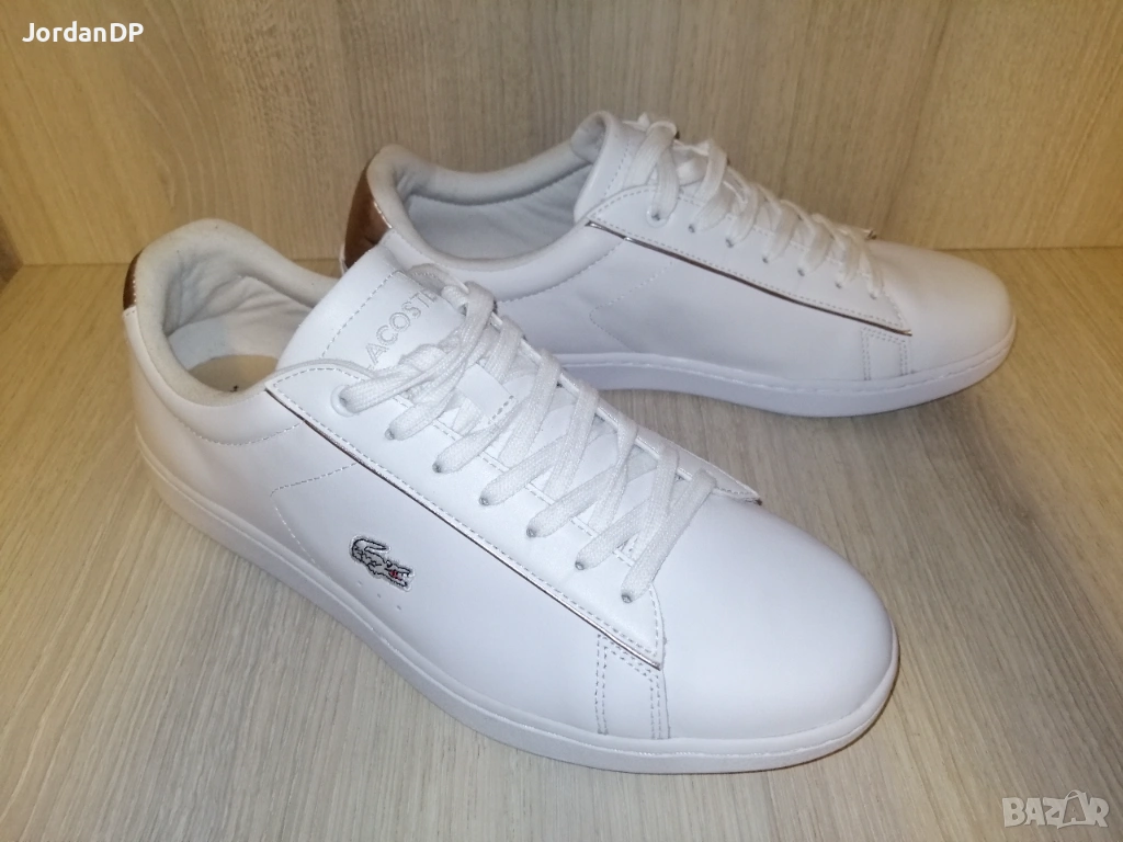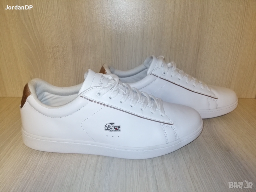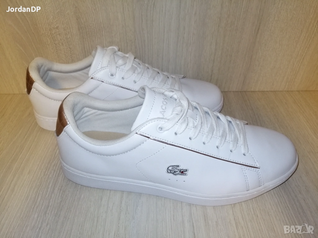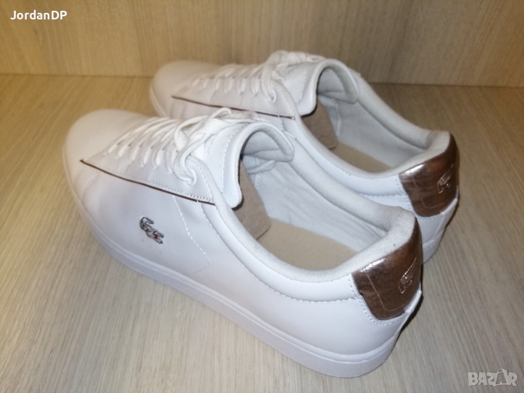 Оригинални спортни обувки Lacoste, чисто нови с кутия. Изработени са от естествена кожа. Бял цвят със златен кант отстрани и златен елемент отзад.