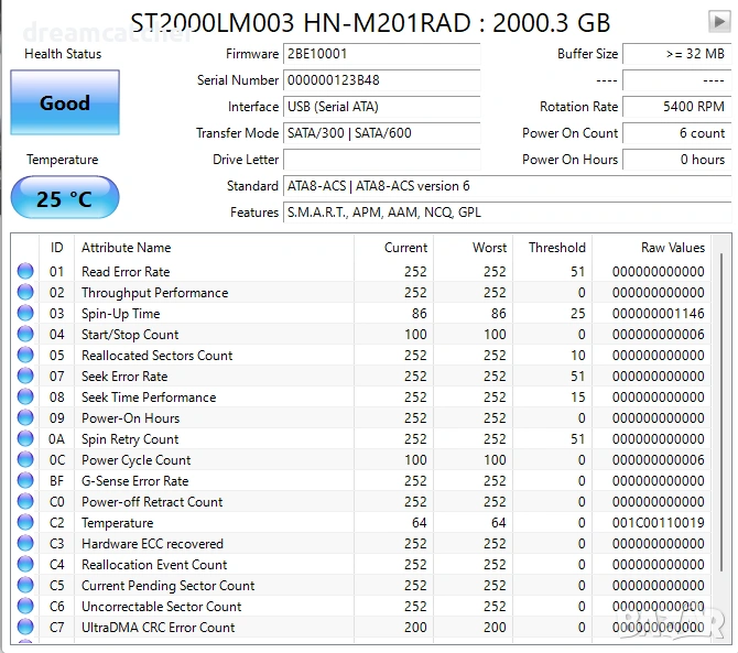 Диска е чисто нов, в тънка кутия и USB 3.0. Toва е оригиналния Samsung M9T диск, който е сред най бързите 2.5", има 32Mb cache, PRM технлогия (не забавя като почне да се напълва и записа е също толкова бърз като четенето). Съвместим с всички лаптопи с SATA конектор, вякакви десктопи/устройства с SATA конектор и PlayStation 3/4 и някой XBOX. Имам и други цветове, като някой са също на 0 часа или до 100-120 часа. SMART е чист както се вижда. Модела е ST2000LM003