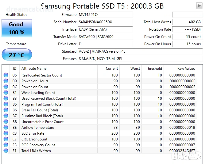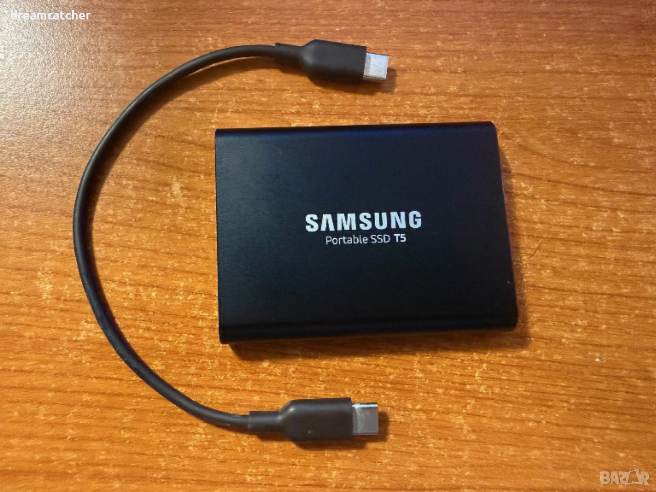 2TB Samsung Portable SSD T5 (в самата кутия има mSATA SSD 2TB на самсунг, което също може да се позлва за други приложения. Работи и с Тесла. Идва с USB-C кабел. Работил е 15 часа и има 400ГБ трансфер. 100% живот.