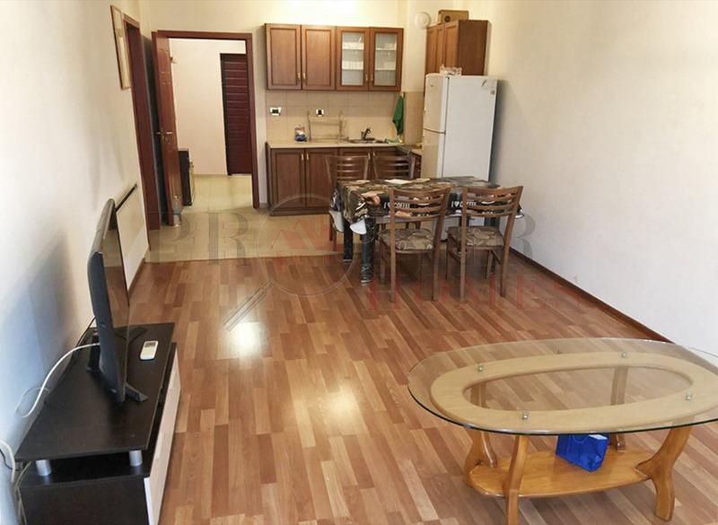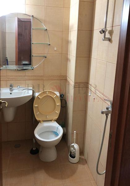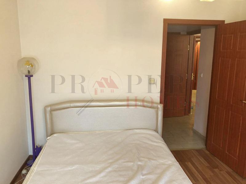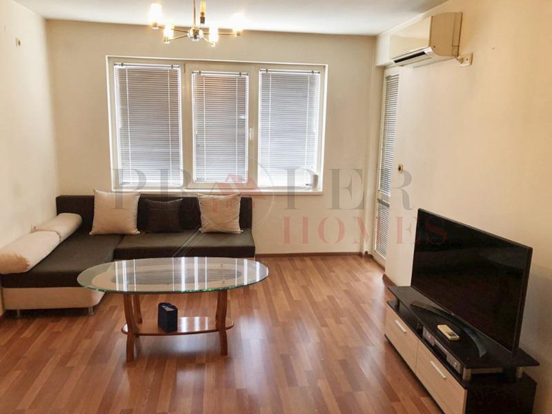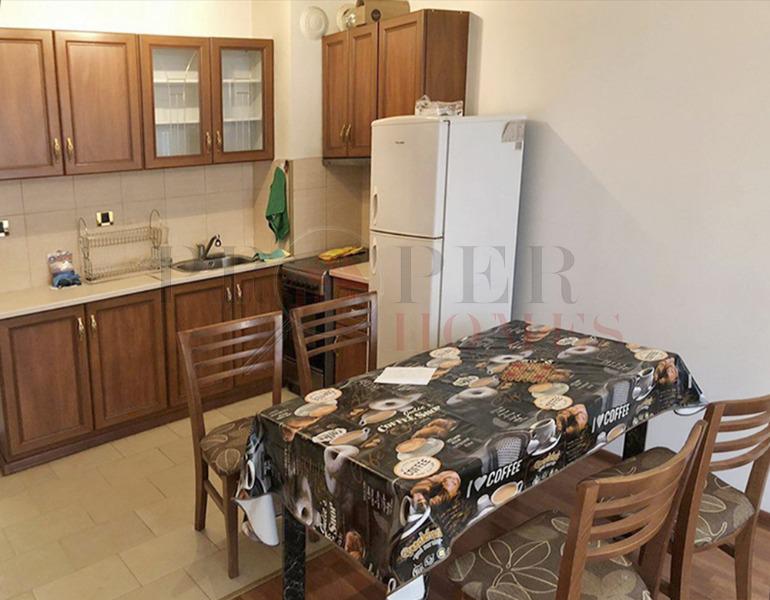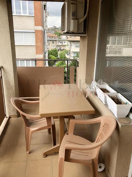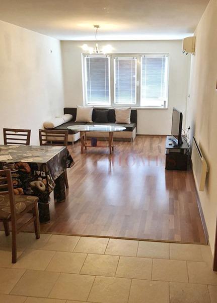 Жилището се намира на пети непоследен етаж в сграда ново строителство. Площта му е разпределена между коридор, просторна светла всекидневна с трапезария и кухненски тракт, две уютни спални, два санитарни възела, мокро помещение и тераса с хубава гледка. Апартаментът се отдава напълно обзаведен и оборудван с всички необходими мебели и ел. уреди: готварска печка, абсорбатор, хладилник, пералня, климатик в дневната и конвектор във всяка стая. Към имота има и гараж.