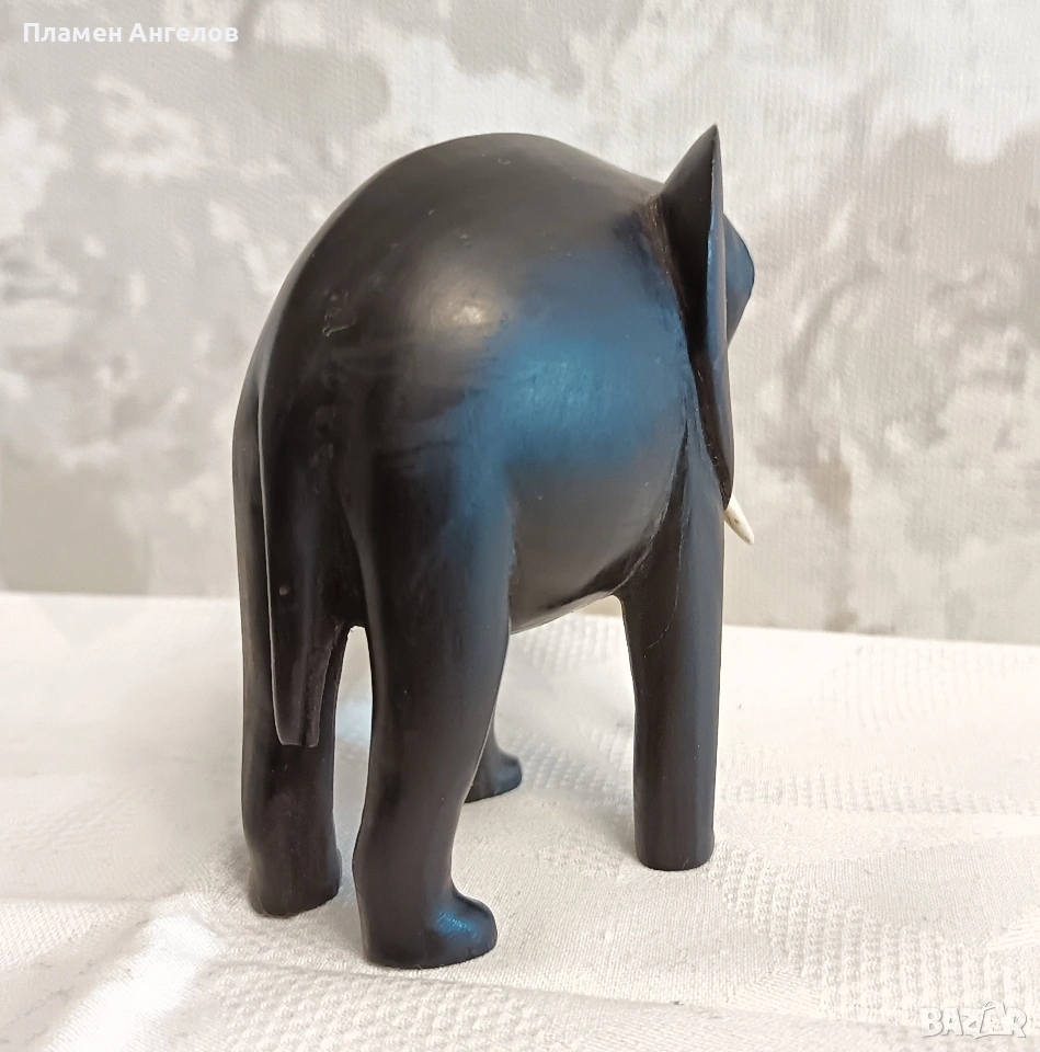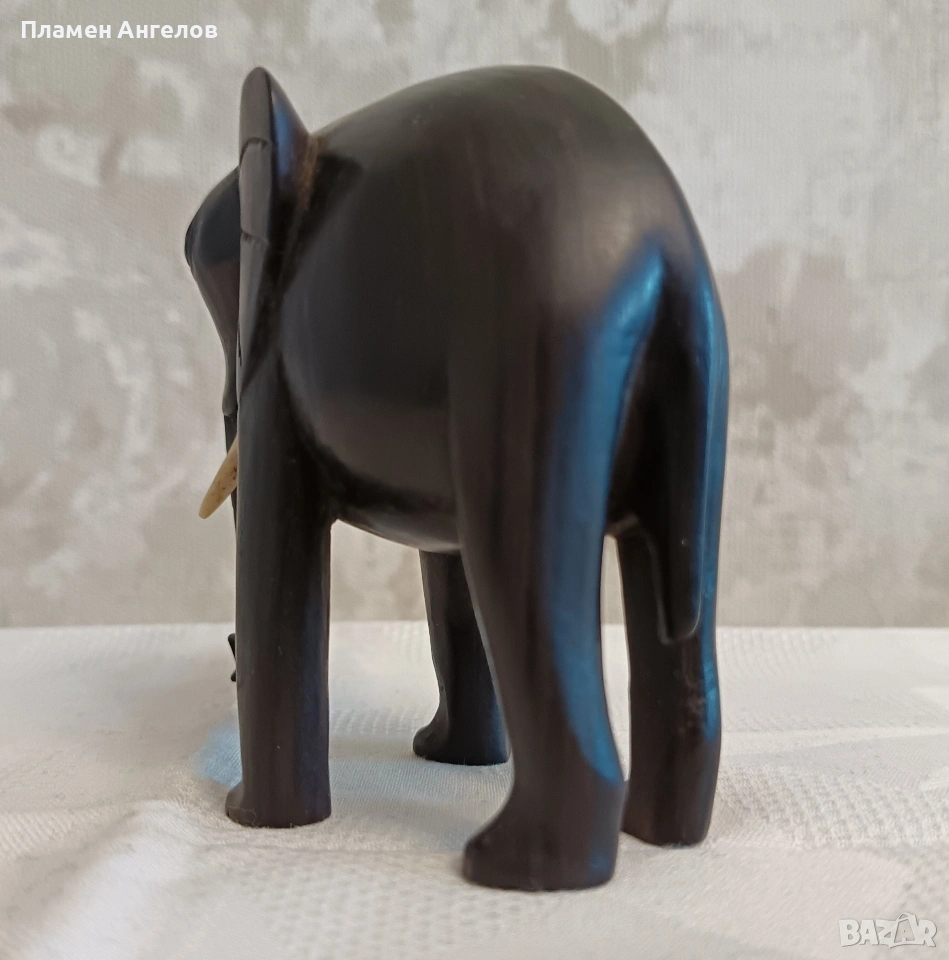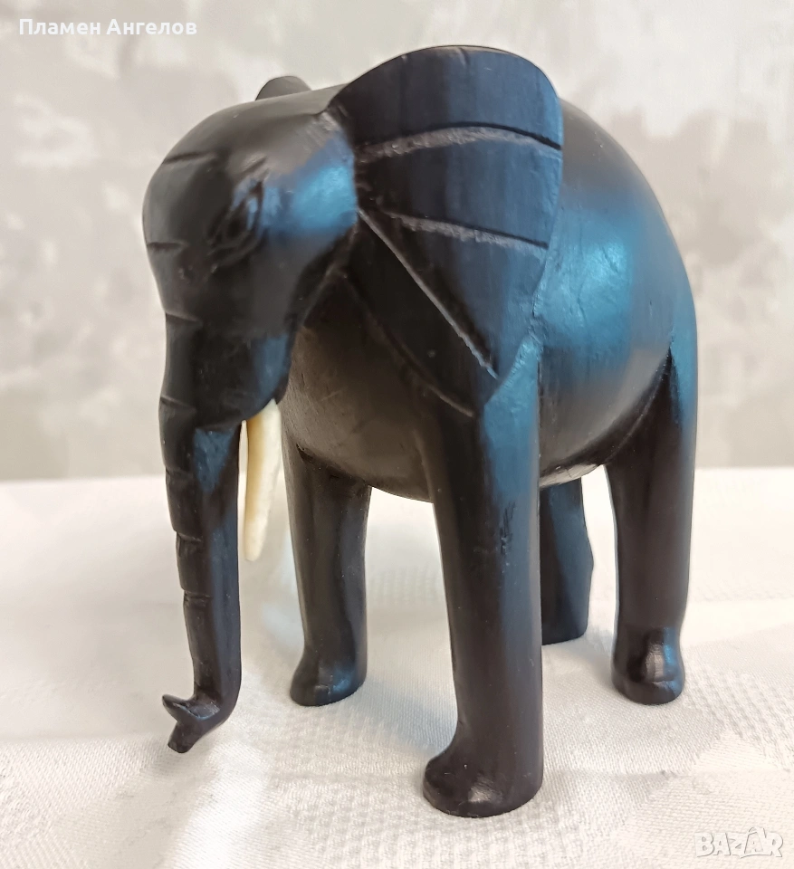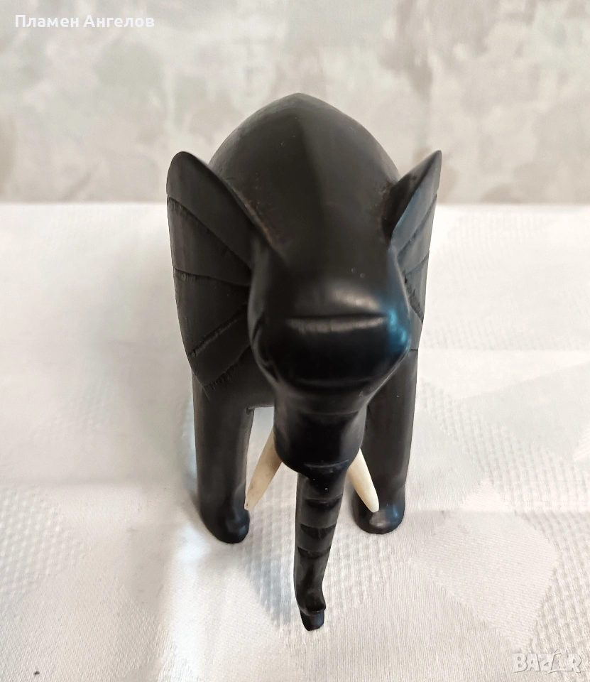 Красива, ръчно изработена фигурка на слон изваяна от автентично абаносово дърво(Ebony). Дървото е тежко, масивно с характерен естествен черен цвят и плътност. Гарантирано и проверено материал абанос и бивни от кост. Височина 9.5см.и дължина 10см.Ръчна, местна изработка от Шри Ланка, Африка. Отлично запазена без забележки и пукнатинипо дървото и стабилно монтирани бивни.