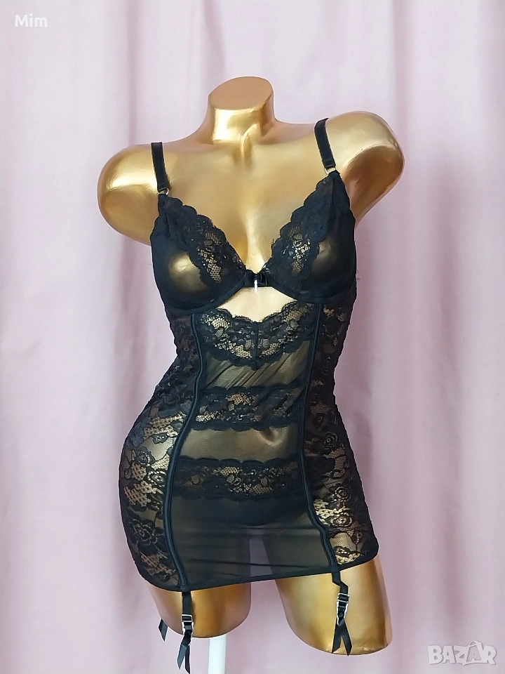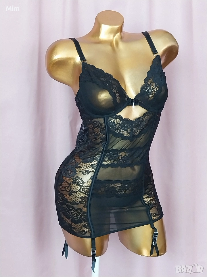 Черна ,моделираща, дантелена рокля с мека чашка В долната част с подплънка за повдигане на бюста с банели, регулируеми презрамки двуредно закопчаване,подгръдна от 80 до 90 см еластичност, с 4 жартиери за чорапи,дължина 65 см Неразличима от нова.
