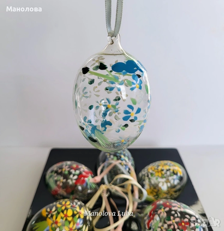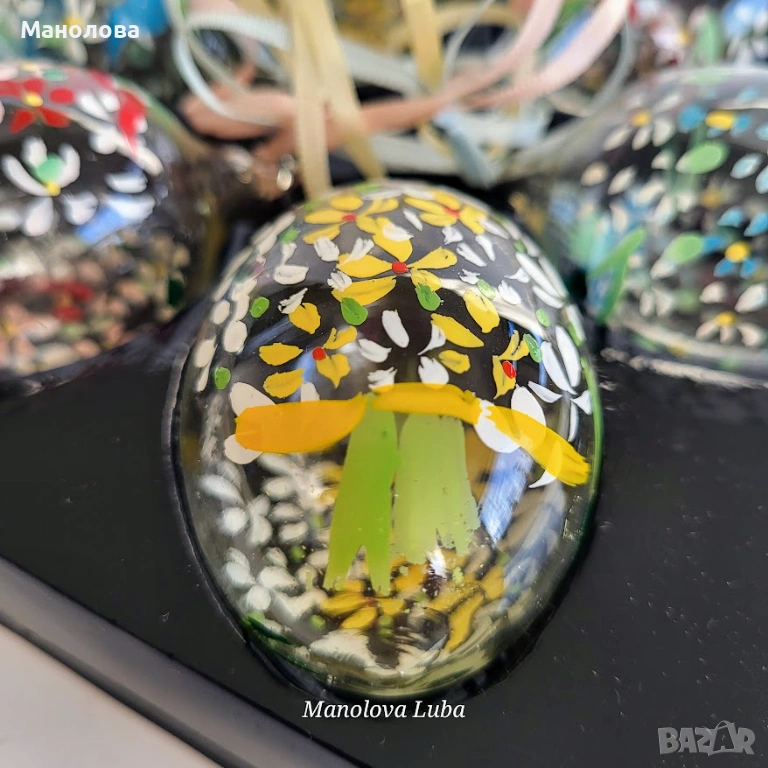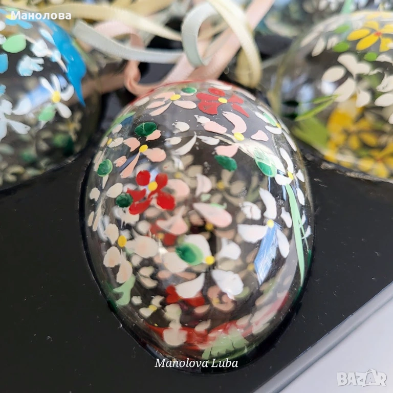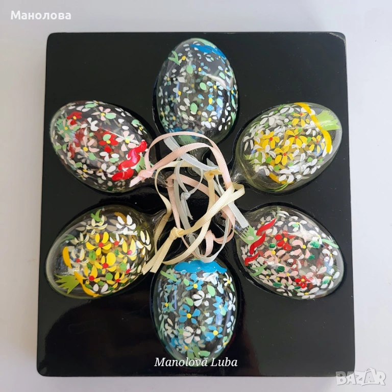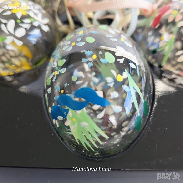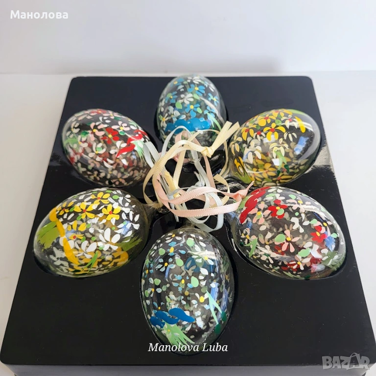 Декорирани са ръчно с акрилни бои. Всяко яйце има уникален цветен декор и копринена панделка за окачване. Този стил на ръчно изрисувани мотиви е характерен за висококачествени занаятчийски артикули. Подходящи са както за великденска декорация на дома, така и за оригинален подарък. В оригиналната си кутия за съхранение, нямат забележки.