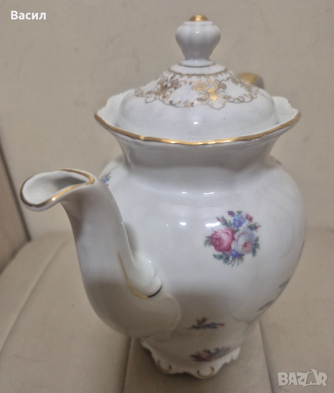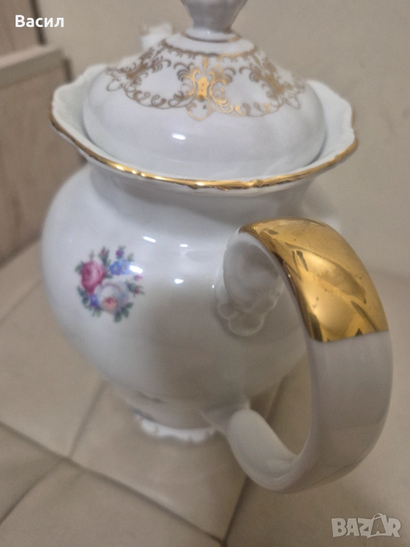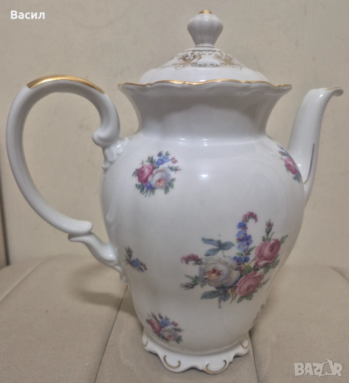 Продавам елегантна порцеланова кана от немската фабрика Seltmann Weiden, серия Theresia. Произведена в Бавария, Германия, в средата на XX век. Отличава се с класически релефен дизайн и изчистен бял порцелан.Позлата!