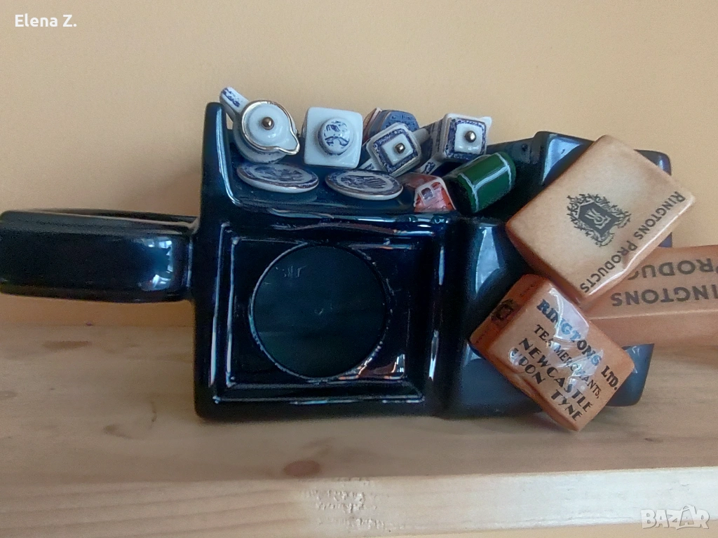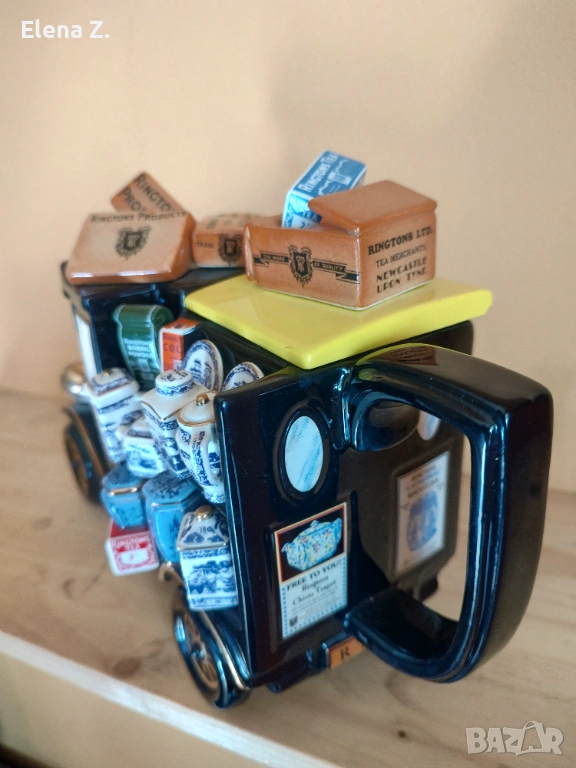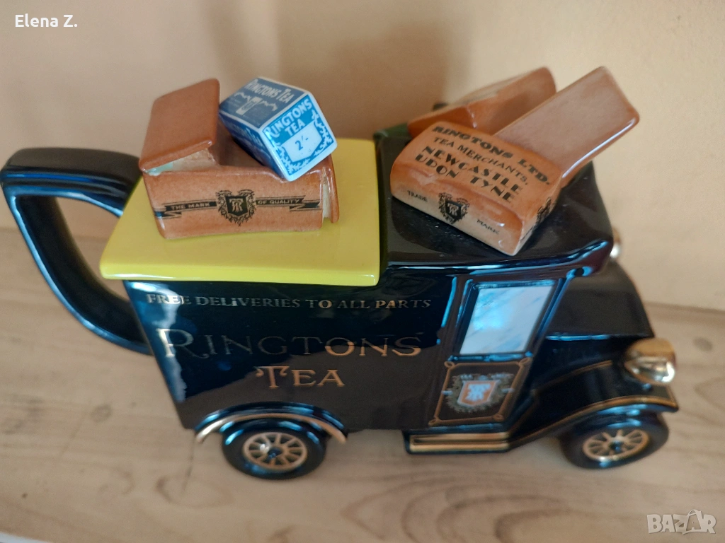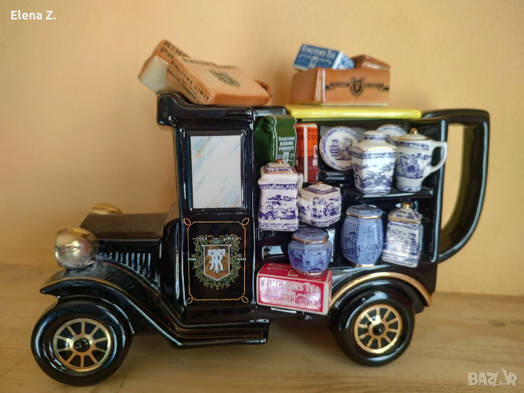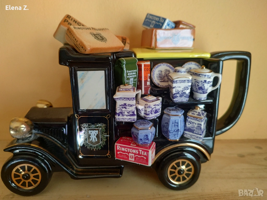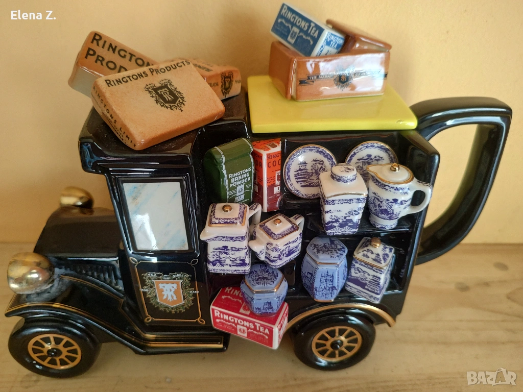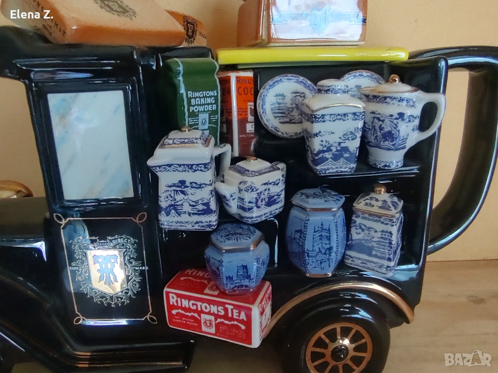 Прекрасен, ръчно изработен декоративен чайник във формата на ретро камионче за доставка на чай на Ringtons. Камиончето е препълнено със чайници и други съдчета с декор Old Willow, както и с други продукти предлагани за доставка, като чай, кафе, бисквити и т.н.