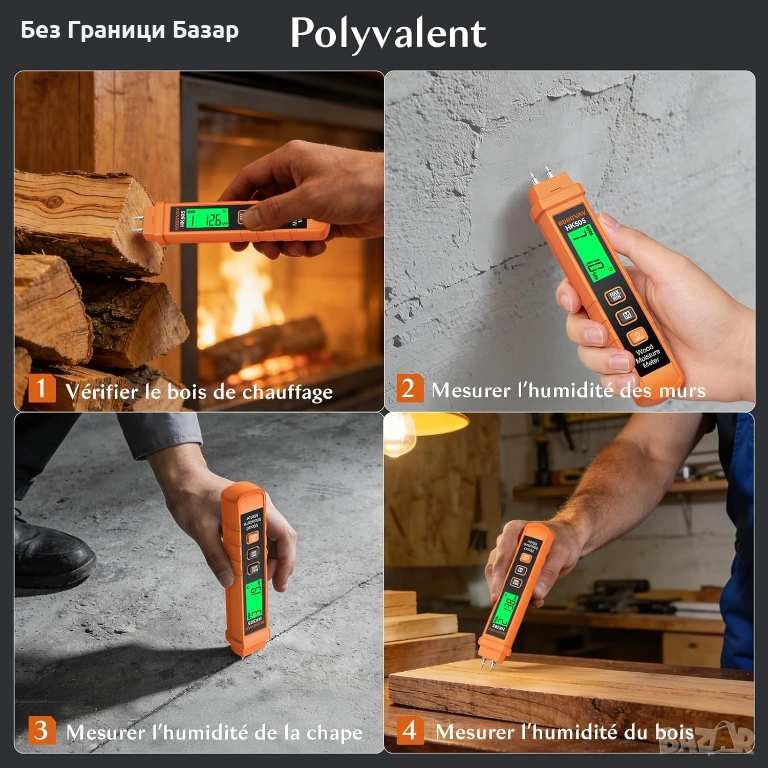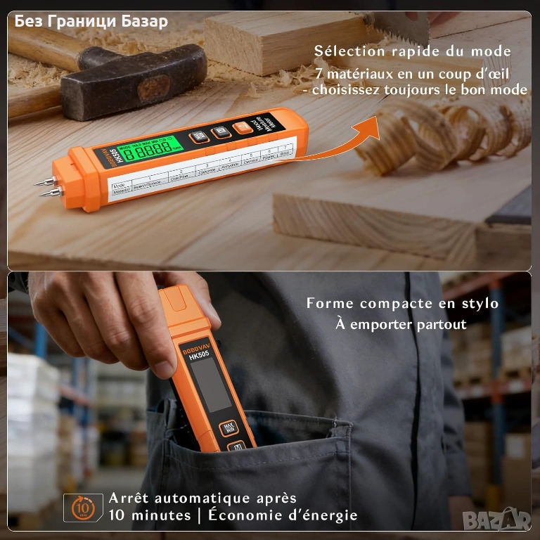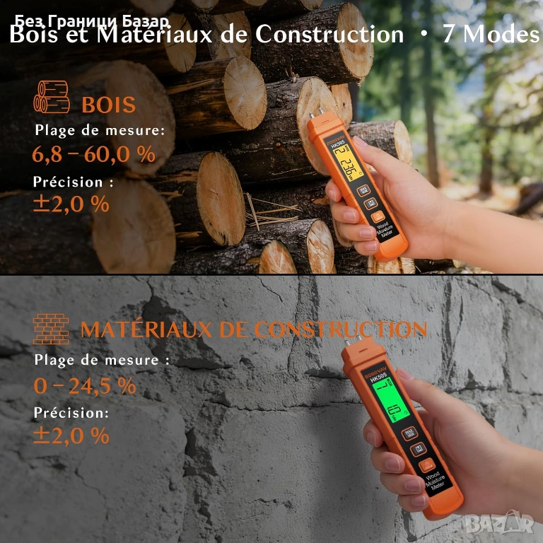 Поддържа 7 калибрации на материали за дърво и строителни повърхности