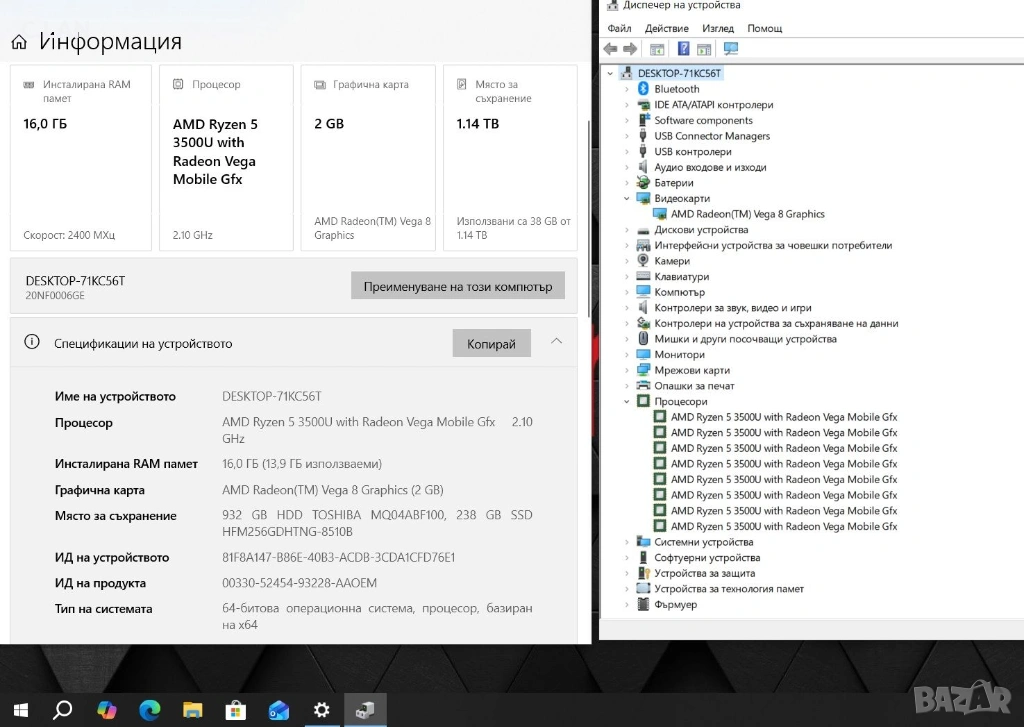 Процесор: AMD Ryzen 5 3500U (4x 2.10-3.70GHz 4MB)