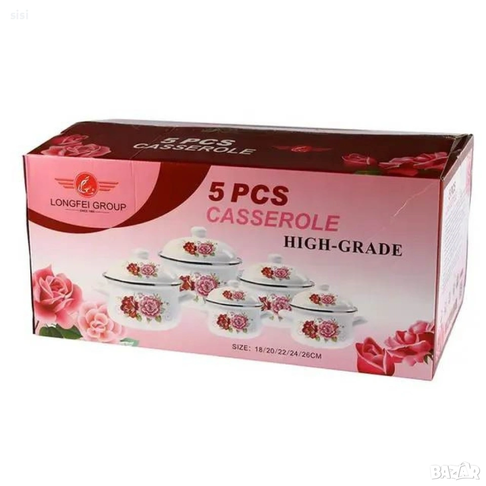 Емайлирани тенджери 5 бр. с незалепващо покритие и с емайлирани капаци. Подходящи за приготвяне на различни ястия, осигурявайки равномерно загряване. Съдовете са с качествено емайл покритие, могат да се използват върху керамични и др. готварски плотове, подходящи и за електрически и газови печки. Не са съвместими с индукционни котлони. Съдовете са лесни за почистване, може да се поставят и в миялна машина. Размери: 18, 20, 22, 24, 26 см. Материал: Емайл.