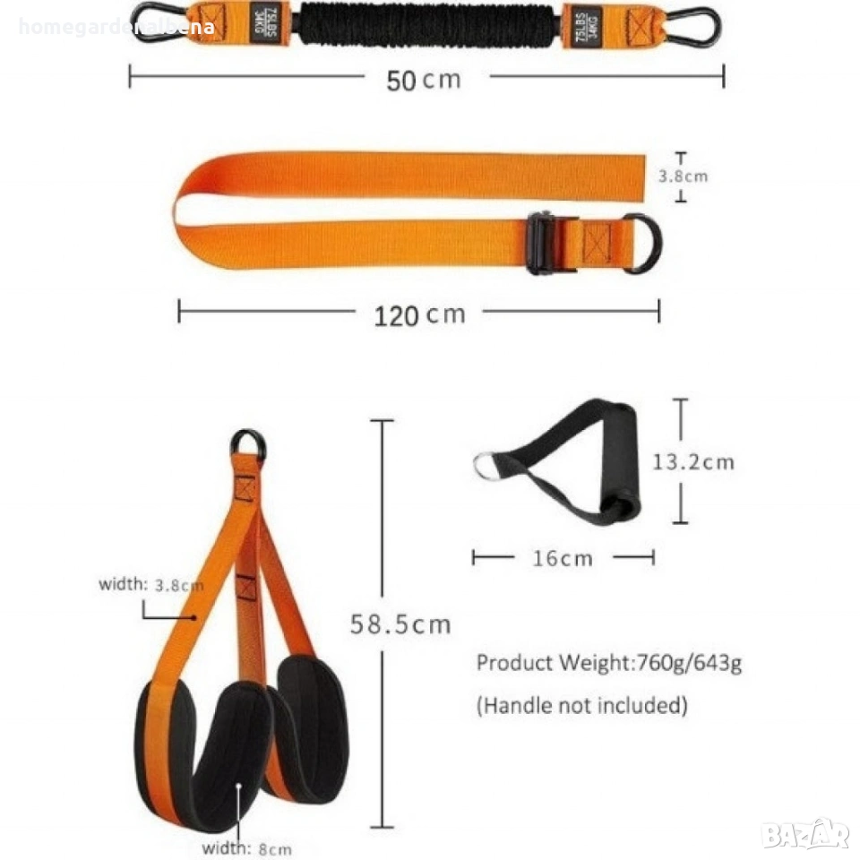 Конструкцията включва латексови тръби с текстилно покритие, здрави метални халки и стоманена катарама за максимална издръжливост. Двойната опора за крака с ширина 8 см осигурява стабилно и комфортно положение по време на упражнението, а регулируемите ленти позволяват персонализирана настройка според ръста и предпочитанията. Каишката е с дължина около 120 см, латексните ластици – около 50 см, а общата височина на конструкцията е около 58,5 см. Теглото на комплекта е приблизително 643–760 г в зависимост от конфигурацията.