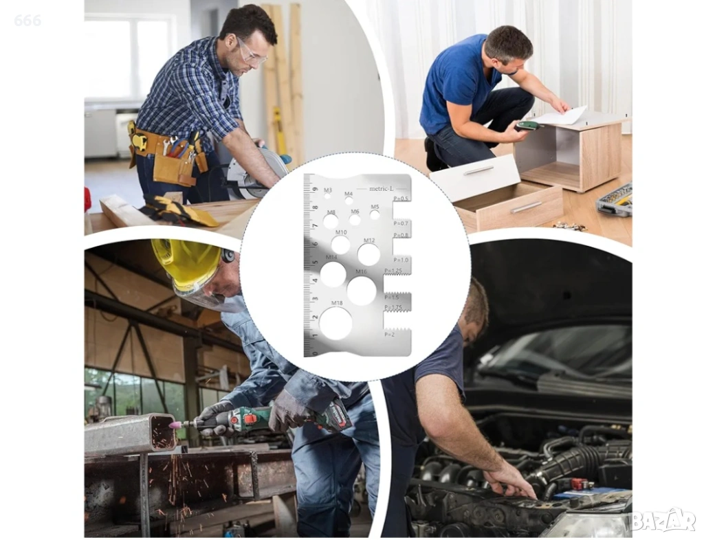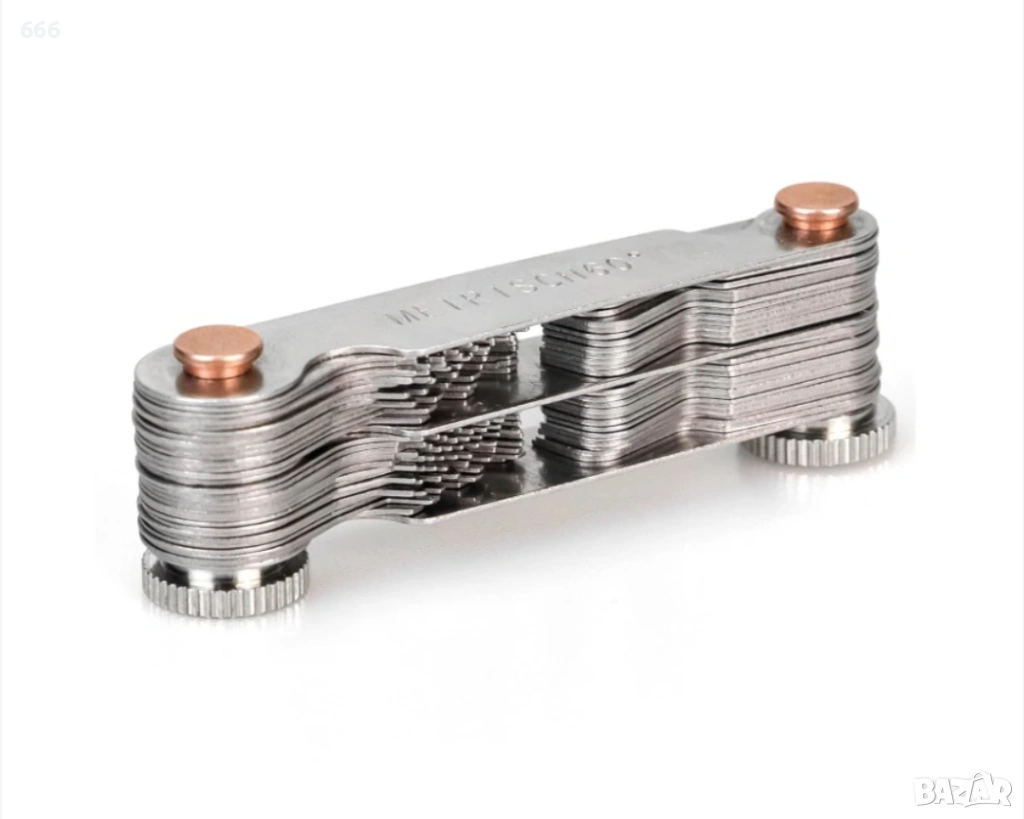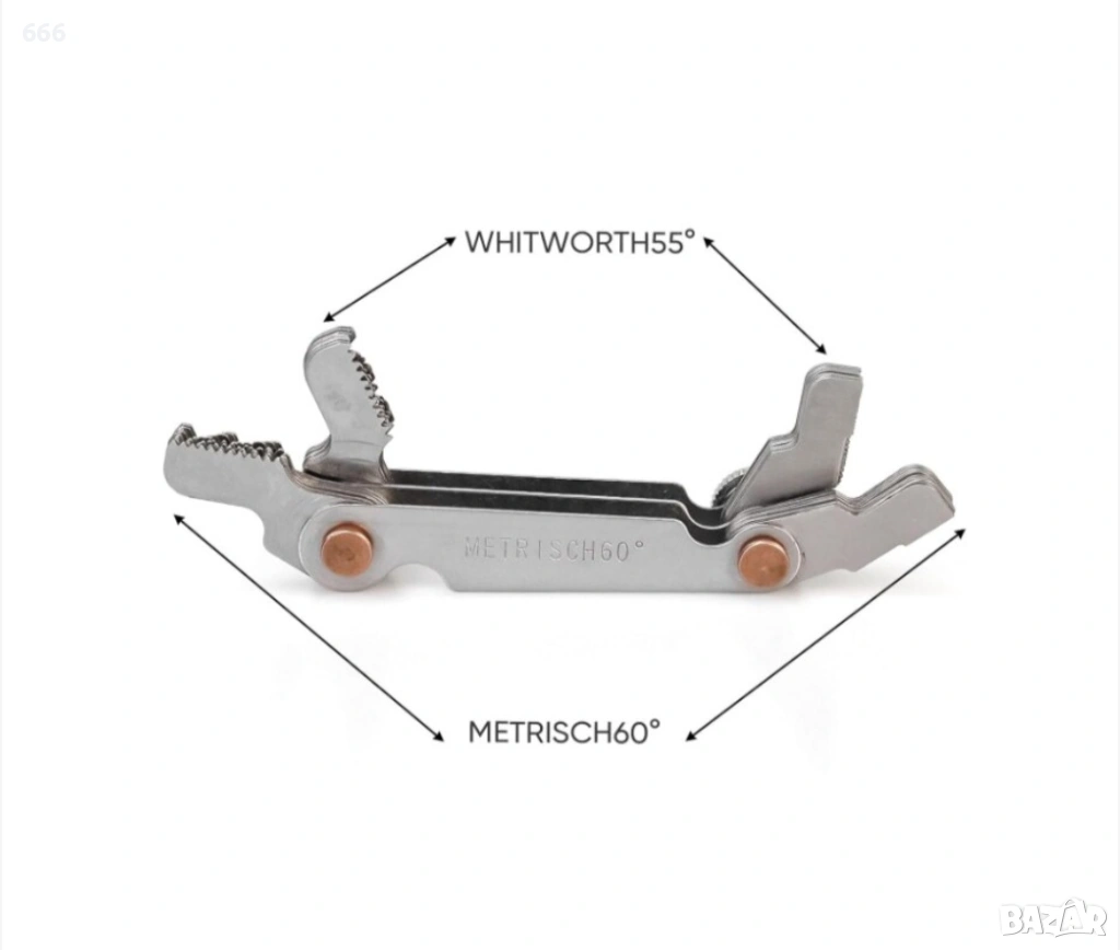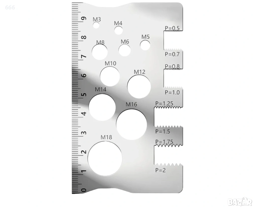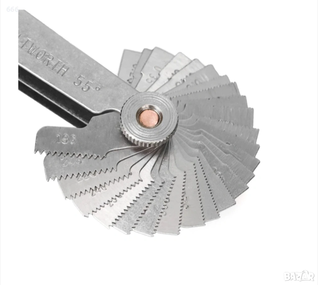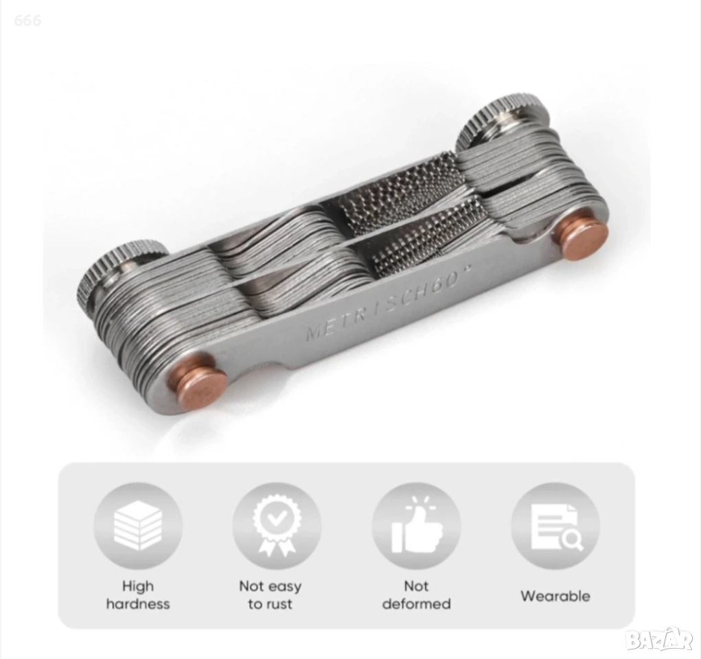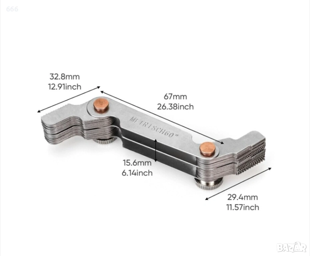 В двата края има малък отвор, който е удобен за регулиране и разглобяване с винтове. Можете лесно да завъртите острието за измерване на стъпката на резбата, където натиснете индикатора за резба на зъбите. Цифрите са ясно обозначени и лесни за четене.
