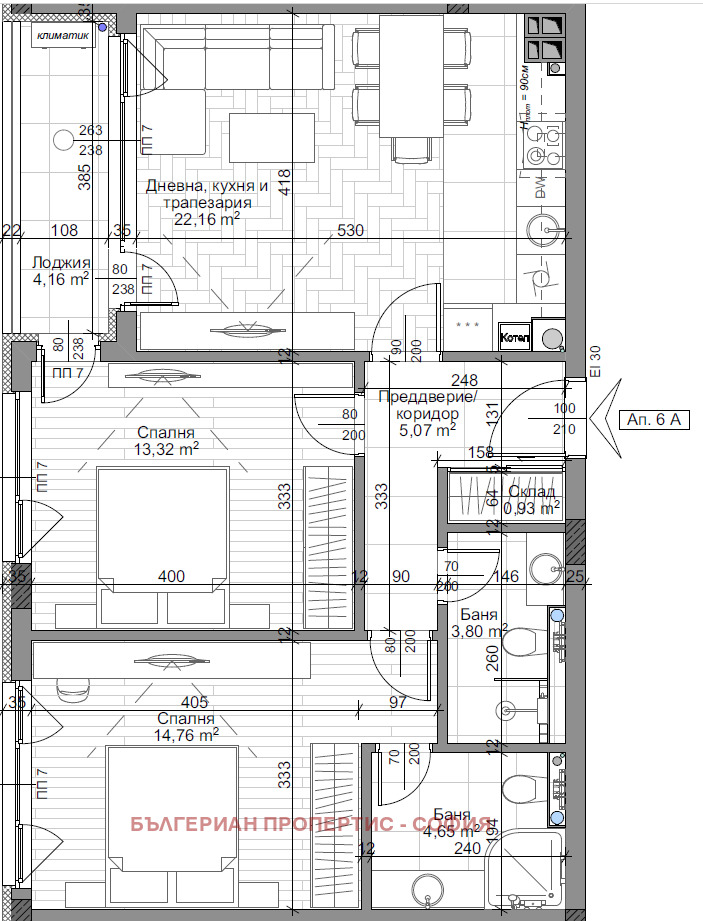 Апартамент A6 , обща площ 93.48 кв.м. (нетна площ 80.13 кв.м. + общи части 13.35 кв.м.).