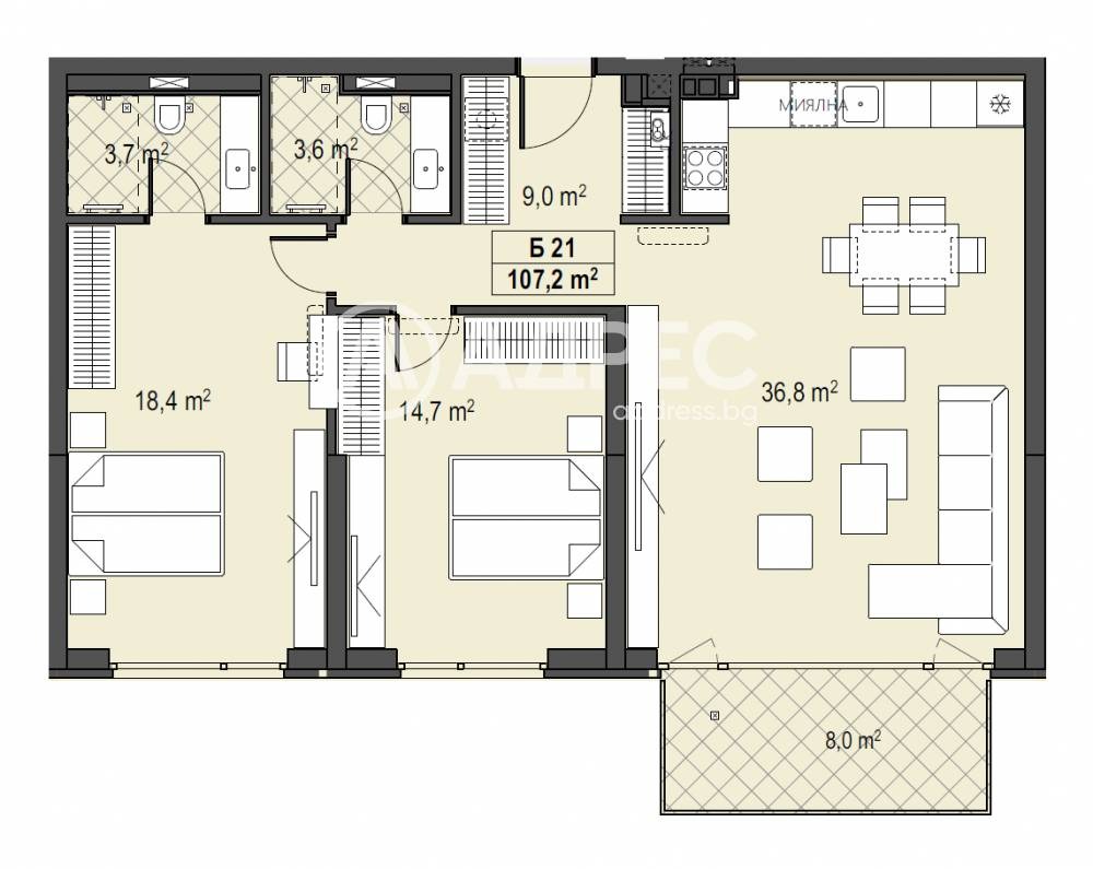 Прекрасен тристаен апартамент с южно изложение, позициониран на втори жилищен етаж/трети реален етаж с РЗП-118,99м2, просторни стаи и разкошна тераса. Върху площ от 107,2м2 са разположени: дневна с кухненски бокс и трапезария-36.80м2, спалня -18,4м2 с 3,7м2 баня към нея, втора спалня-14,7м2, втора баня с тоалетна-3,6м2 и тераса-8,0м2. Налични ПМ и гаражи. Термопомпа в цената на всеки апартамент! Без комисион.
