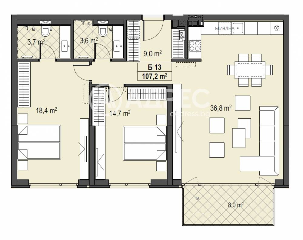 Прекрасен тристаен апартамент с южно изложение, позициониран на първи етаж над партер с РЗП-118,99м2, просторни стаи и разкошна тераса. Върху площ от 107,2м2 са разположени: дневна с кухненски бокс и трапезария-36,8м2, спалня -18,4м2 с 3,7м2 баня към нея, втора спалня-14,7 м2, втора баня с тоалетна- 3,6м2 и тераса-8,0м2. Налични ПМ и гаражи. Термопомпа в цената на всеки апартамент! Без комисион.