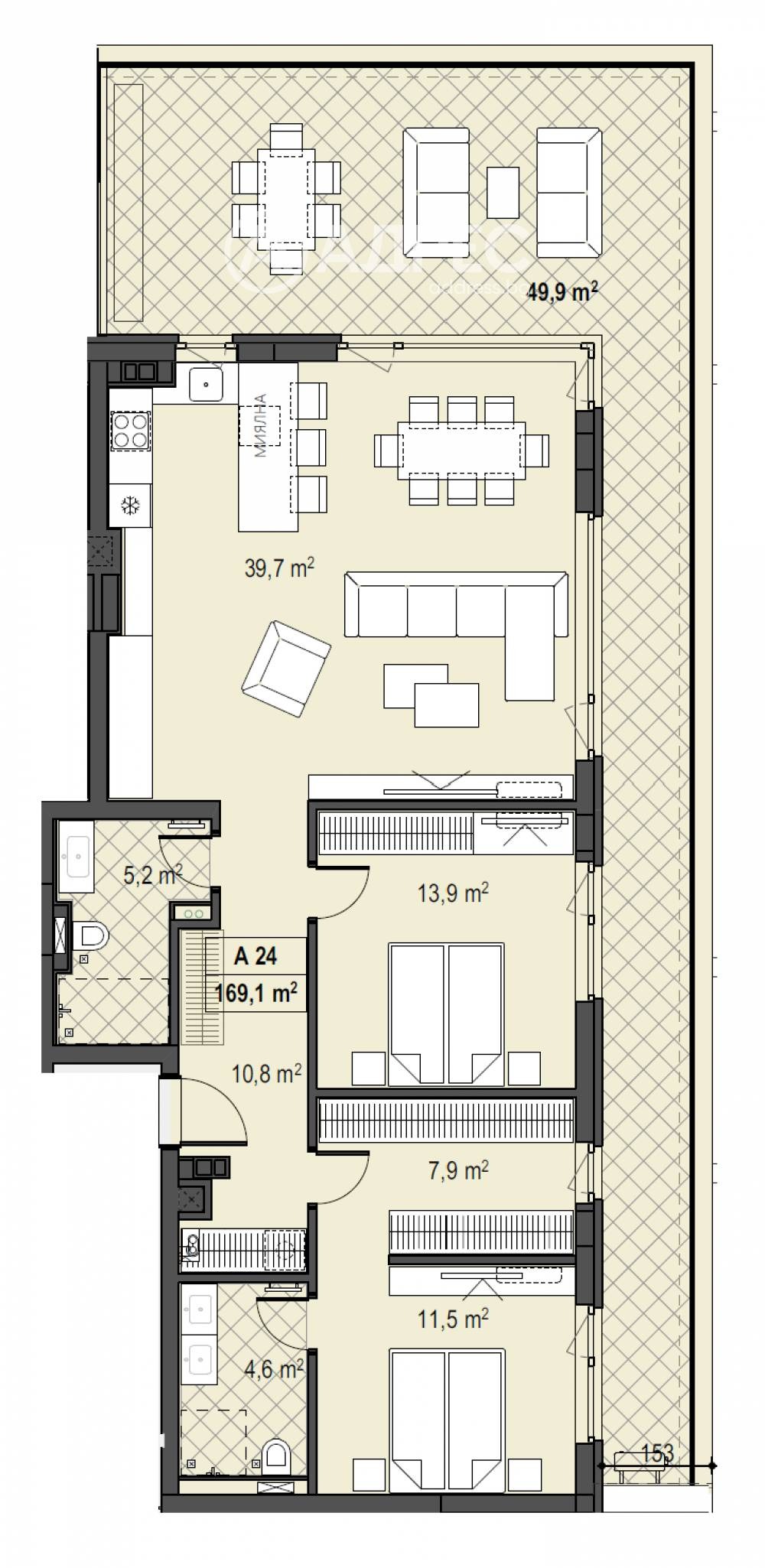 Прекрасен тристаен апартамент със западно изложение, позициониран на последен четвърти етаж с РЗП-187,74м2, просторни стаи и разкошна тераса. Върху площ от 169,10м2 м2 са разположени: дневна с кухненски бокс и трапезария-39,7м2, спалня с гардеробна-19,4м2 и 4,6м2 баня към нея, втора спалня-13,9м2, още една баня с тоалетна и разкошна парти тераса-49,9м2. Налични ПМ и гаражи. Термопомпа в цената на всеки апартамент! Без комисион.