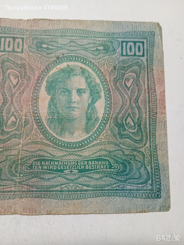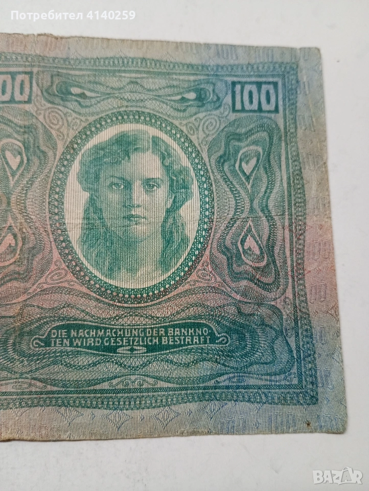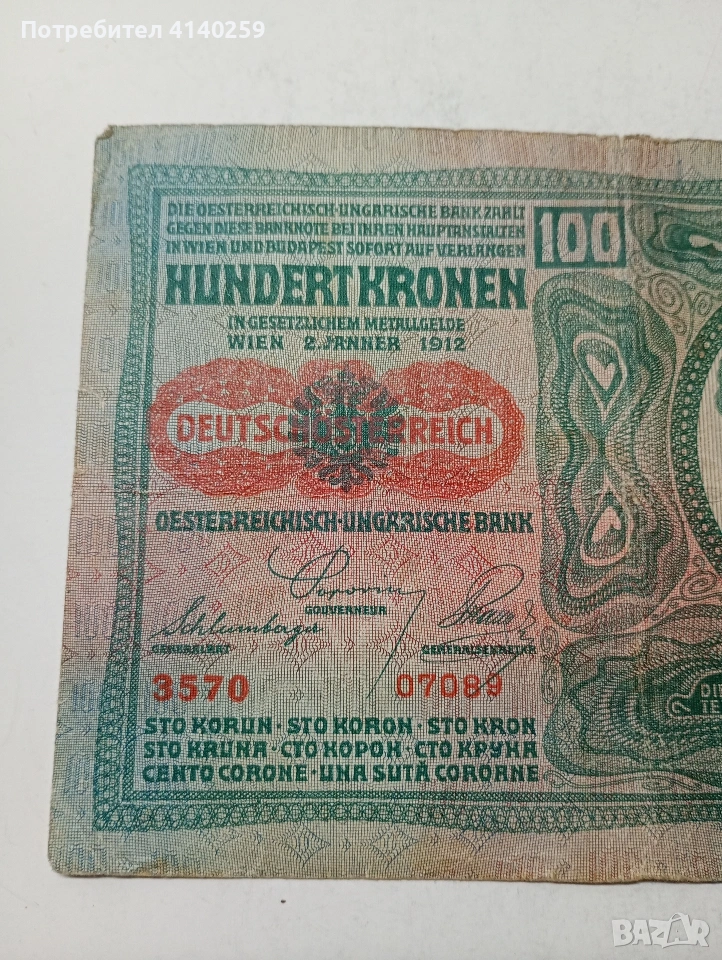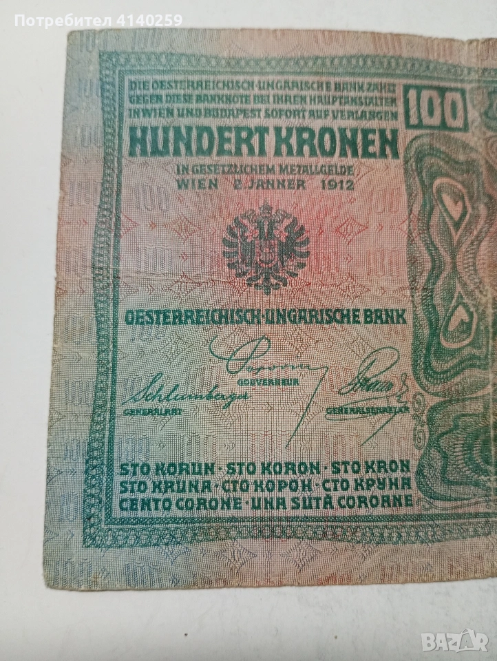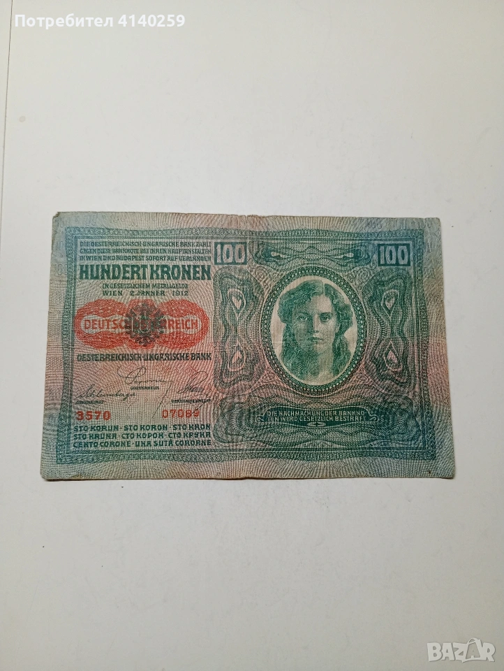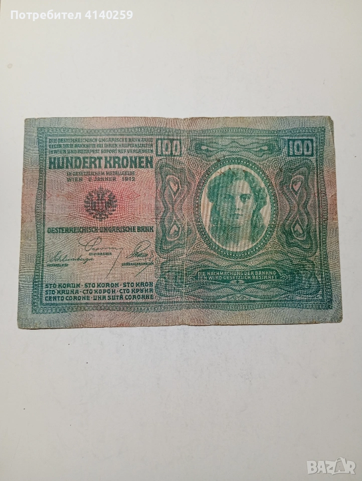 АВСТРО -УНГАРИЯ БАНКНОТА 100 КРОНИ 1912 Г СЪСТОЯНИЕ ВИДИМО ПОЛУЧАВАТЕ СНИМАНАТА БАНКНОТА РАЗГЛЕДАЙТЕ ДРУГИТЕ МИ ОБЯВИ ДА КОМБИНИРАТЕ ДОСТАВКА ЕКОНТ ЗА ВАРНА ЛИЧНО