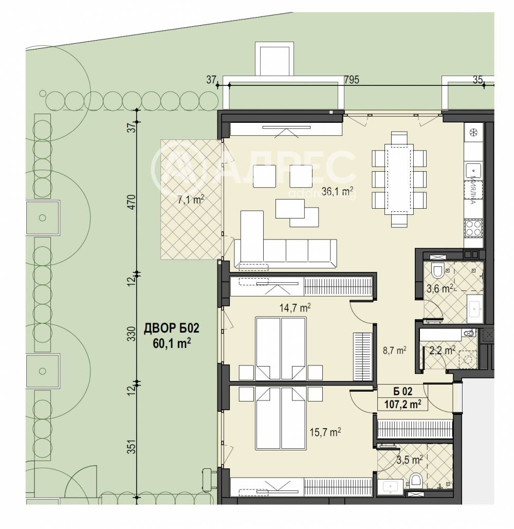 Прекрасен тристаен апартамент със западно изложение, позициониран на партерно ниво с РЗП-118,99м2 , просторни стаи и разкошен прилежащ двор. Върху площ от 102,7м2 са разположени: дневна с кухненски бокс и трапезария-36.1м2, спалня -15,7м2 с 3,5м2 баня към нея, втора спалня-14,7 м2, втора баня с тоалетна-3,6м2, мокро помещение/склад, тераса-7.1м2 и разкошен двор от 60,1 м2. Налични ПМ и гаражи. Термопомпа в цената на всеки апартамент! Без комисион.
