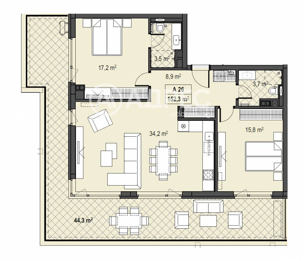 Прекрасен тристаен апартамент със изложение запад/юг, позициониран на последен етаж с РЗП-169,03м2, просторни стаи и разкошна тераса. Върху площ от 152,30м2 са разположени: дневна с кухненски бокс и трапезария-34,2м2, спалня 17,2м2 с баня с тоалетна към нея-3,7м2, втора спалня-15,5 м2, още една баня с тоалетна-3,5м2 и разкошна парти тераса-44,3м2. Налични ПМ и гаражи. Термопомпа в цената на всеки апартамент! Без комисион.