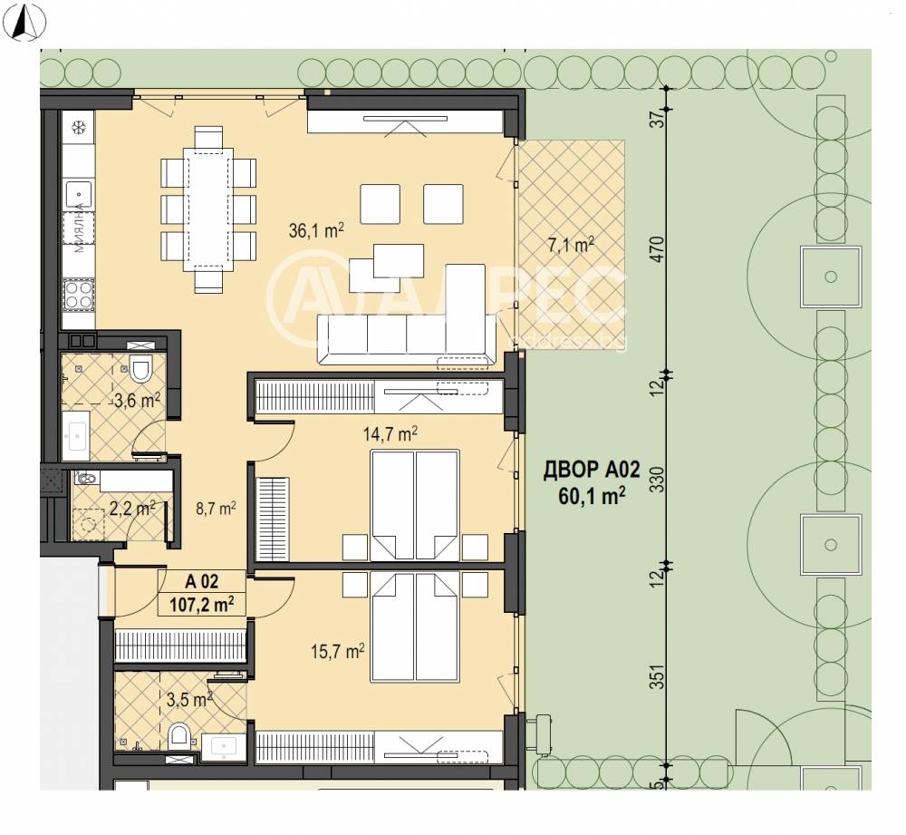 Прекрасен тристаен апартамент с източно изложение, позициониран на партерно ниво с РЗП-118,99м2 , просторни стаи и разкошен прилежащ двор. Върху площ от 102,7м2 са разположени: дневна с кухненски бокс и трапезария-36.1м2, спалня -15,7м2 с 3,5м2 баня към нея, втора спалня-14,7 м2, втора баня с тоалетна, мокро помещение/склад, тераса-7.1м2 и разкошен двор от 60,1 м2. Налични ПМ и гаражи. Термопомпа в цената на всеки апартамент! Без комисион!