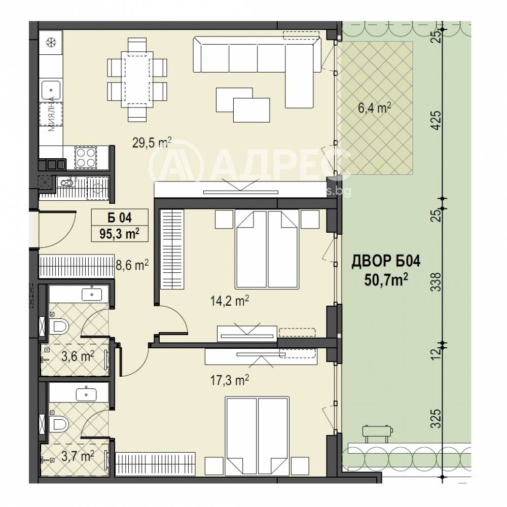 Прекрасен тристаен апартамент със западно изложение, позициониран на партерно ниво с РЗП-105,76м2, просторни стаи и разкошен прилежащ двор. Върху площ от 95,3м2 са разположени: дневна с кухненски бокс и трапезария-29,5м2, спалня -17,3м2 с 3,7м2 баня към нея, втора спалня-14,2 м2, втора баня с тоалетна-3,6м2, тераса-6,4м2 и прилежащ двор от 50,7м2. Налични ПМ и гаражи. Термопомпа в цената на всеки апартамент! Без комисион.