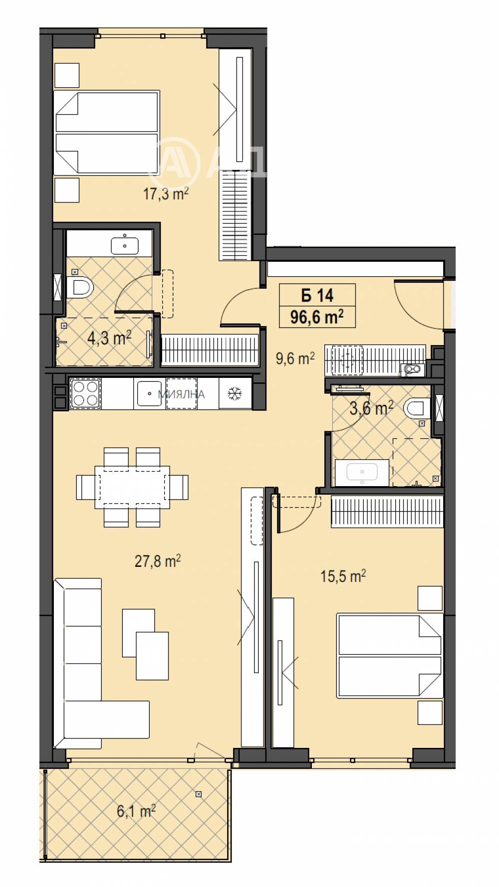 Прекрасен тристаен апартамент с южно изложение, позициониран на първи етаж над партер с РЗП-107,25м2, просторни стаи и тераса. Върху площ от 96,6м2 са разположени: дневна с кухненски бокс и трапезария-27,8м2, спалня -17,3м2 с 4,3м2 баня към нея, втора спалня-15,5 м2, втора баня с тоалетна- 3,6м2 и тераса-6,1м2. Налични ПМ и гаражи. Термопомпа в цената на всеки апартамент! Без комисион. Без комисион.